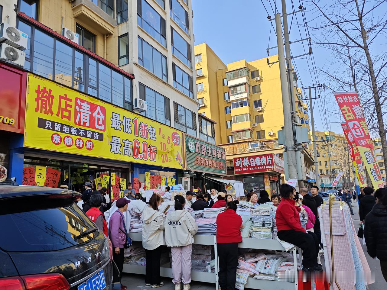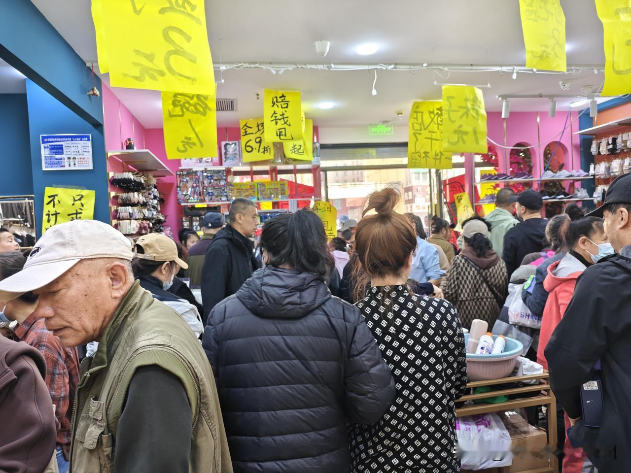 前天晚上陪媳妇打完滴流回家途中,发现路边一家针织品商店打出了撤店清仓的巨大横幅,说是房租到期了,不干了。商品1折起,最高6.9折(见图1)。