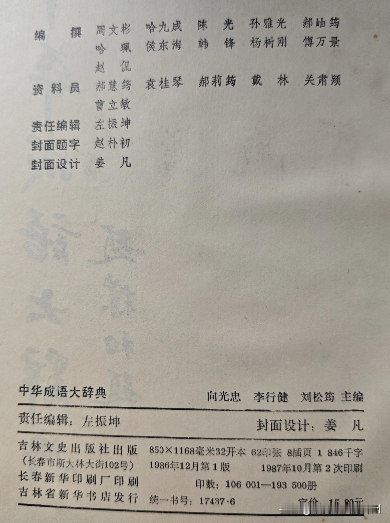 我手头的这个《中华成语大辞典》,是吉林文史出版社出版的,定价15.8元。1986年12月第一版,1987年10月第2次印刷。印数是106001~193500册,可见流传之广,那么想必这错误也是传播得很远。