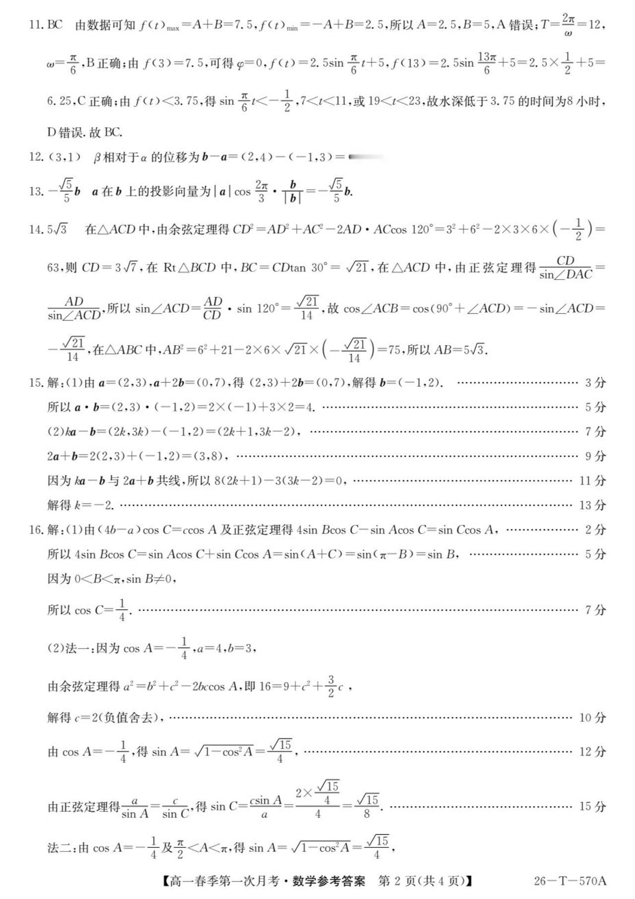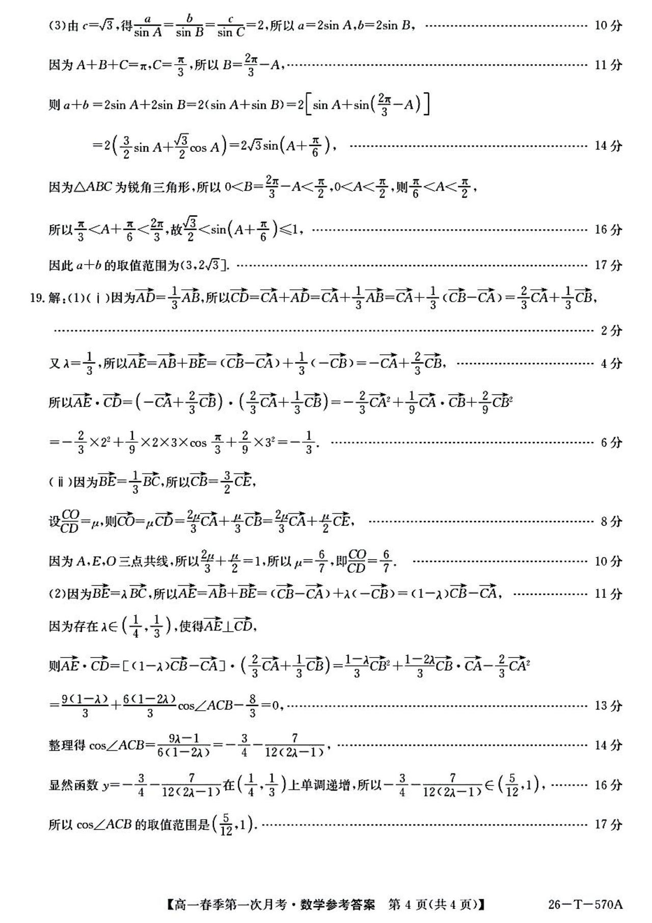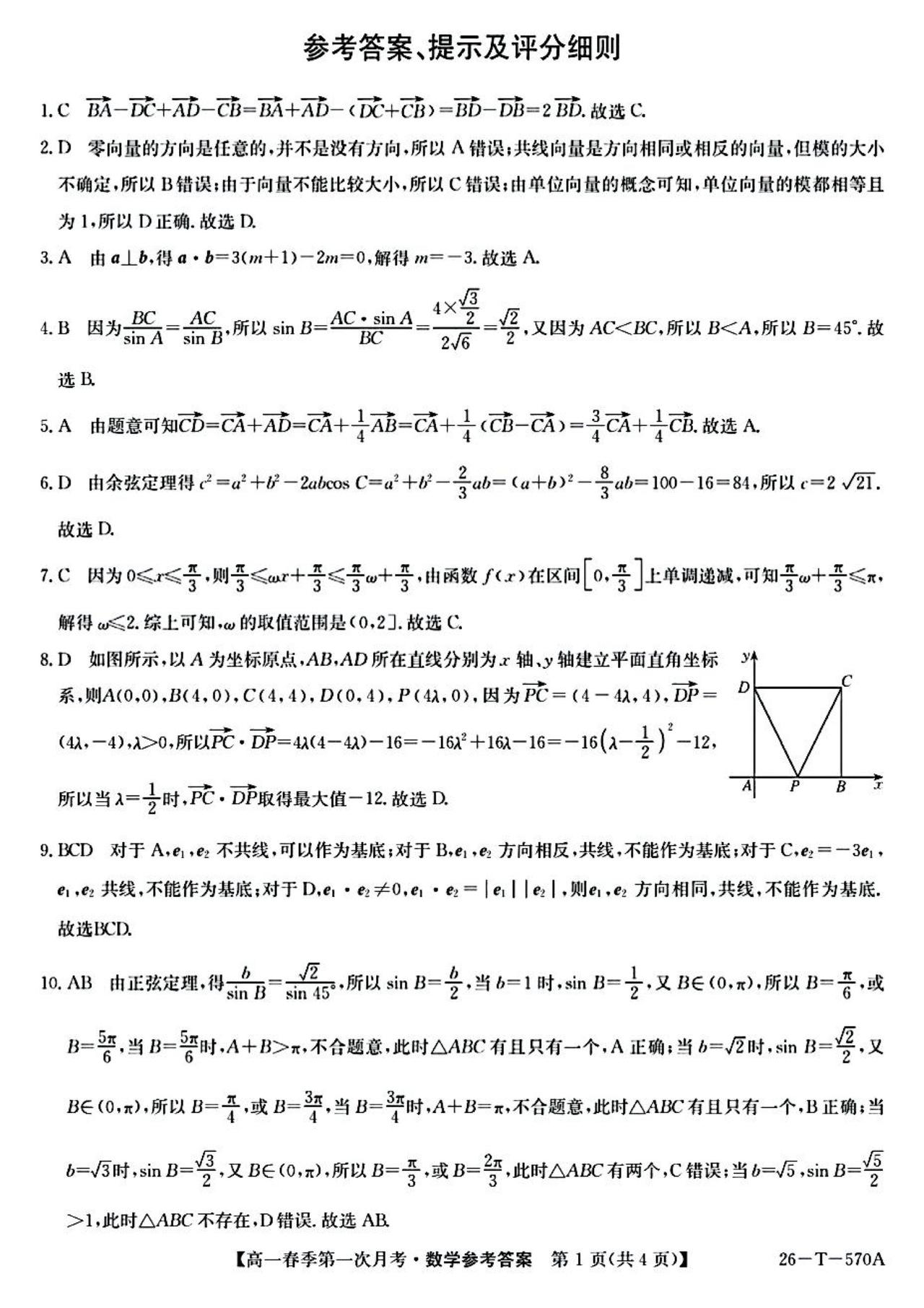 云南省楚雄市2026年上学期高一4月阶段检测数学试题及答案