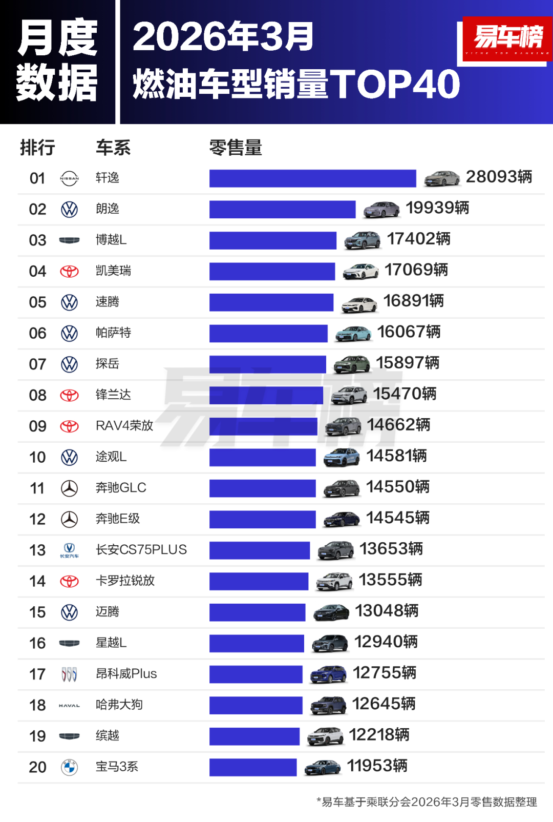 3月燃油车型销量TOP40