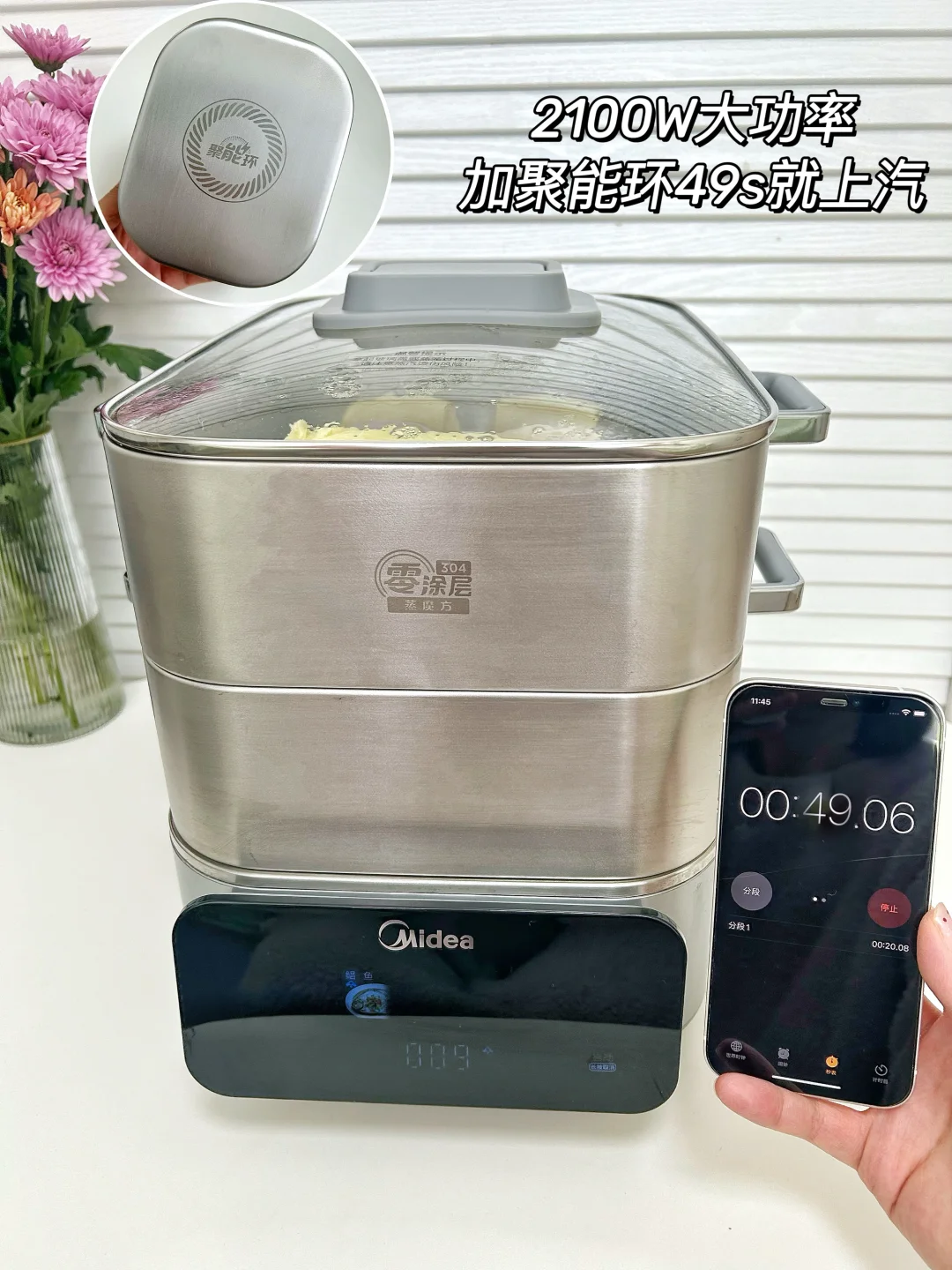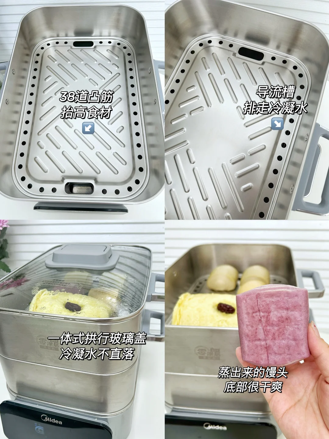 它的冷凝水消失术,得益于42孔环绕蒸片,38道凸筋加导流槽设计~。2100w大功率加聚能环上汽快,蒸菜时软烂入味,蒸面点时蓬松暄软不粘黏,吃起来不会影响口感~