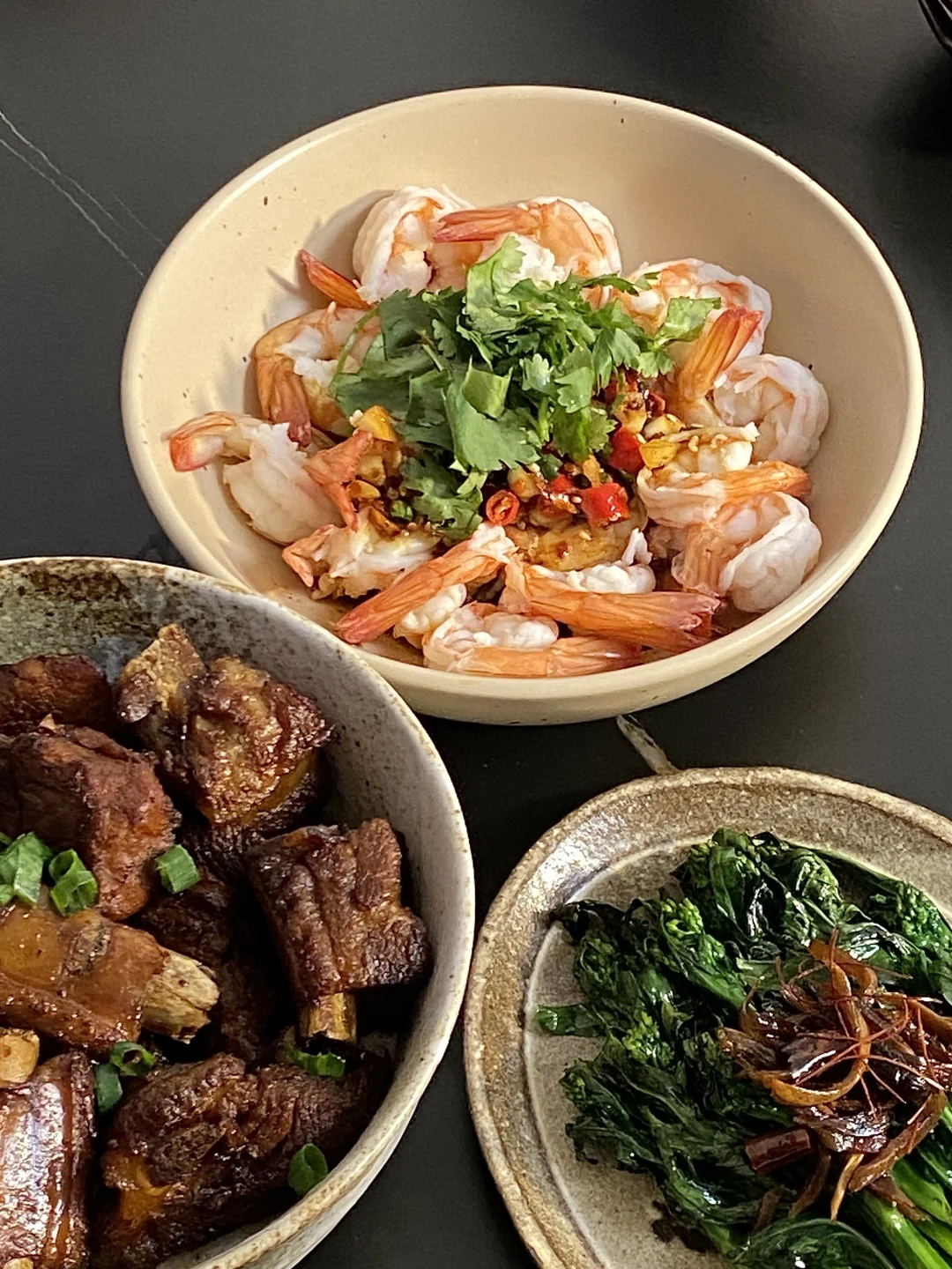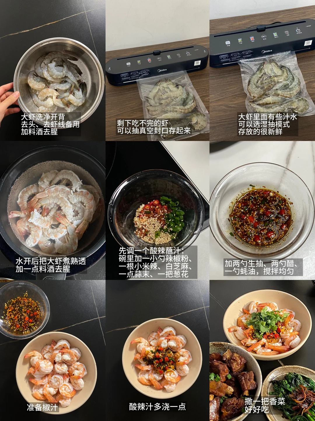 2)大虾洗净开背、去头、去虾线备用,倒入一壶开水,水开后把虾下入煮熟透,加一点料酒去腥,盛出撒一点香菜,倒入酸辣汁蘸着吃