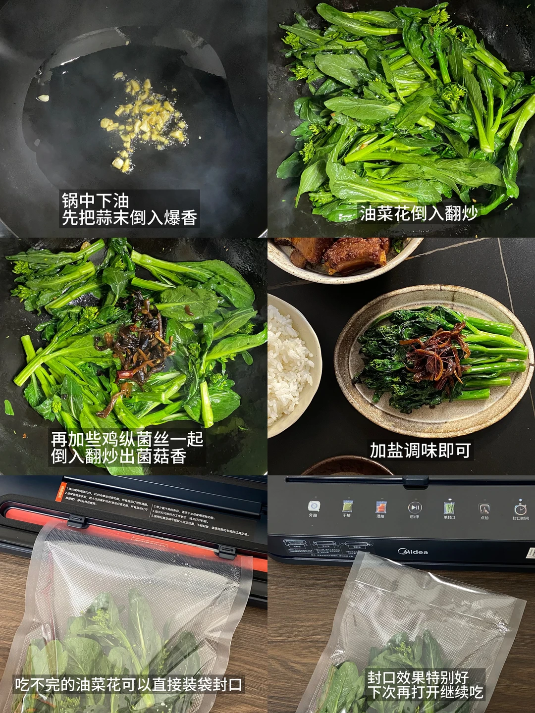 1)蒜末爆香后,锅热了把油菜花倒入翻炒,再加些鸡纵菌丝一起倒入翻炒出菌菇香,加盐调味即可