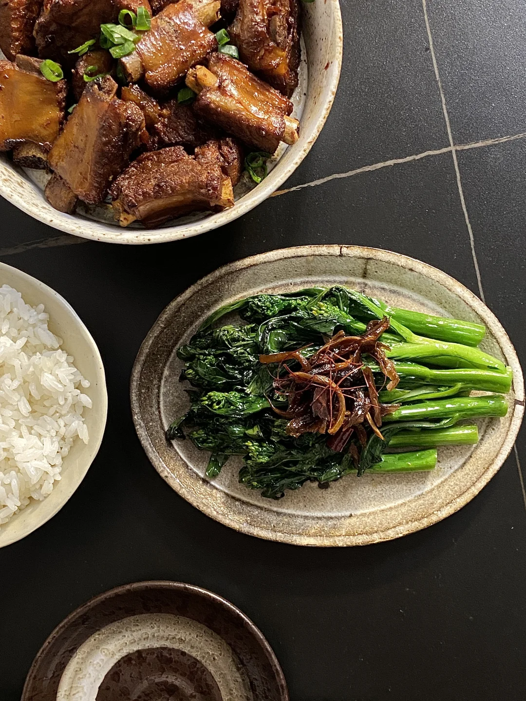 1)肋排剁块,洗净泡水,换水加一生姜、葱、料酒,焯水后备用