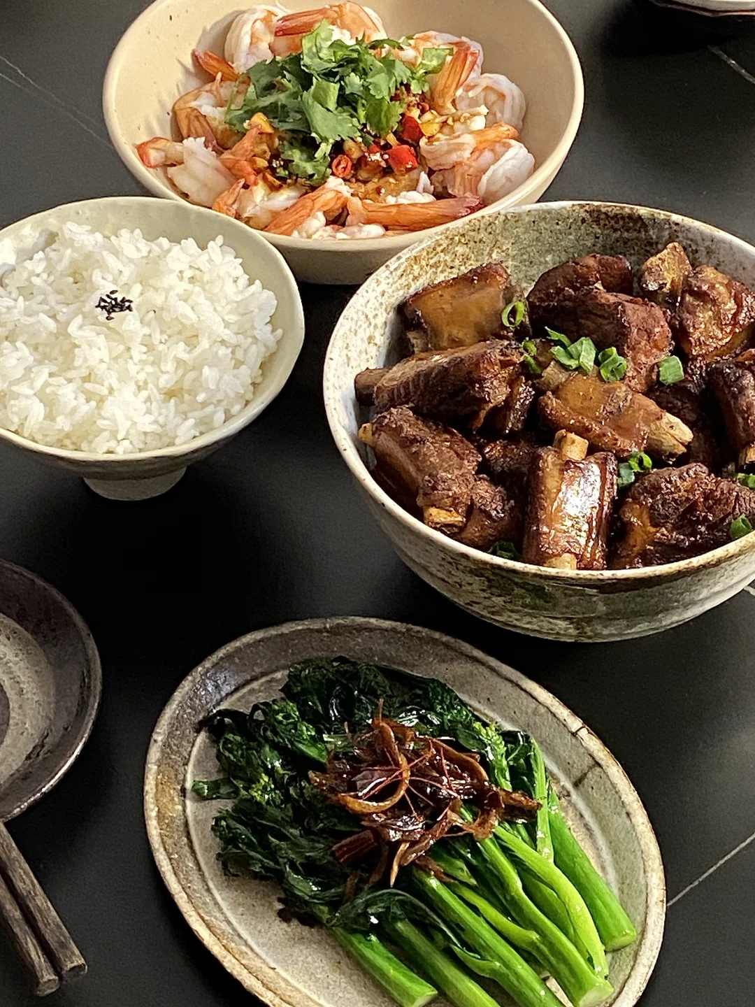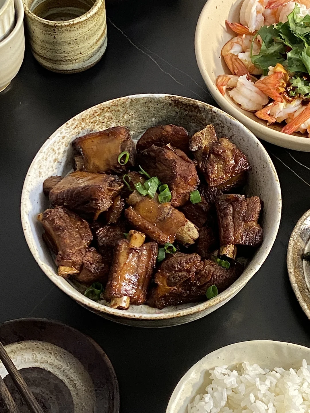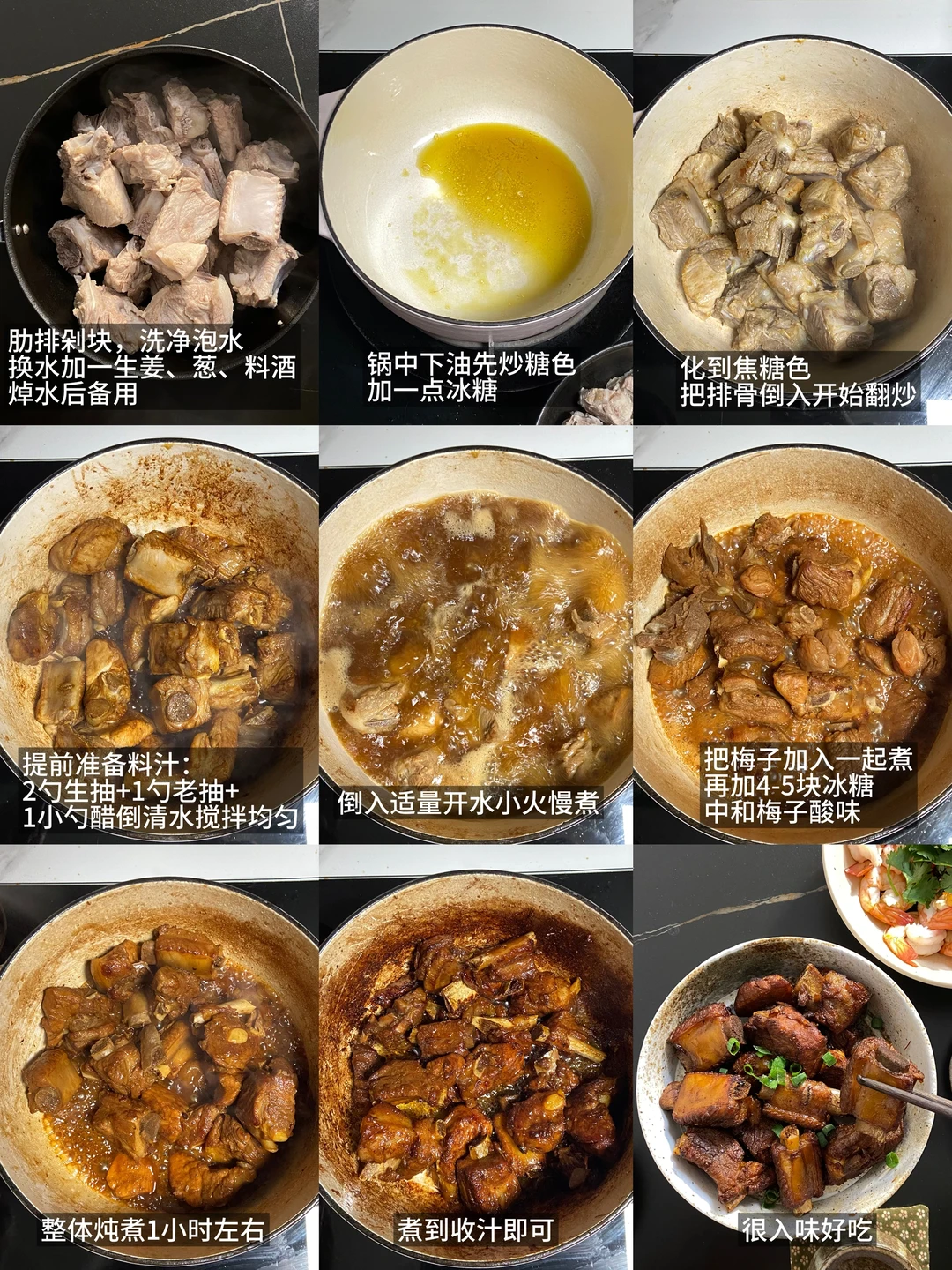 2)锅中下油先炒糖色,加一点冰糖,化到焦糖色把排骨倒入开始翻炒,翻拌均匀,倒入适量开水小火慢煮,把梅子加入一起煮,再加4-5块冰糖中和梅子酸味,整体炖煮1小时左右