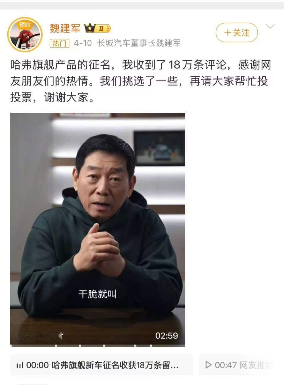 【魏建军发文感谢所有参与征名的网友】魏建军说就听网友的叫长城H10长城汽车董事长