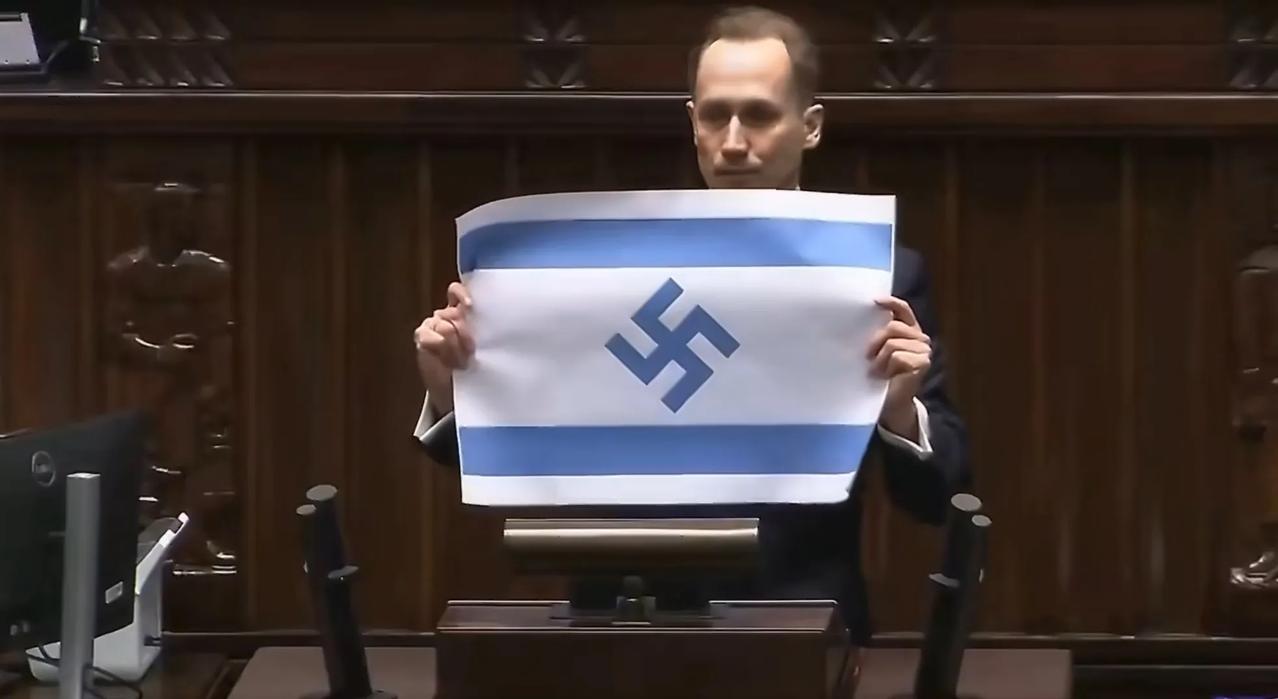 波兰议员贝尔科维奇在波兰议会向在座的议员们展示了一张印有以色列国旗的纸,而在以色列国旗图案正中的六芒星被换成了纳粹标志。贝尔科维奇称现在的以色列和当年的德意志第三帝国没有区别。