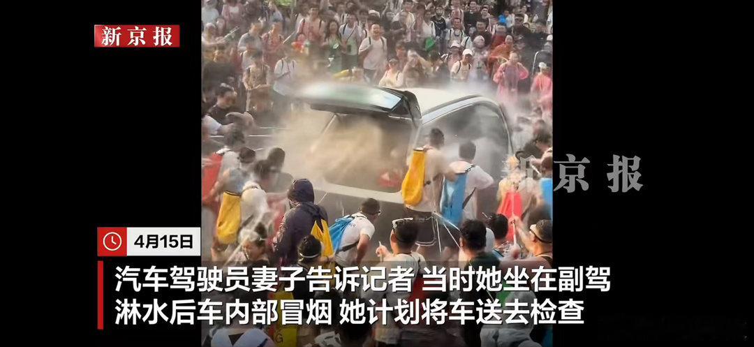 西双版纳泼水节多人向车内喷水 这个确实很奇怪,车辆行驶过程中后备箱门怎么会能打开?第二是这个车怎么开到人群中的,来着相当危险啊