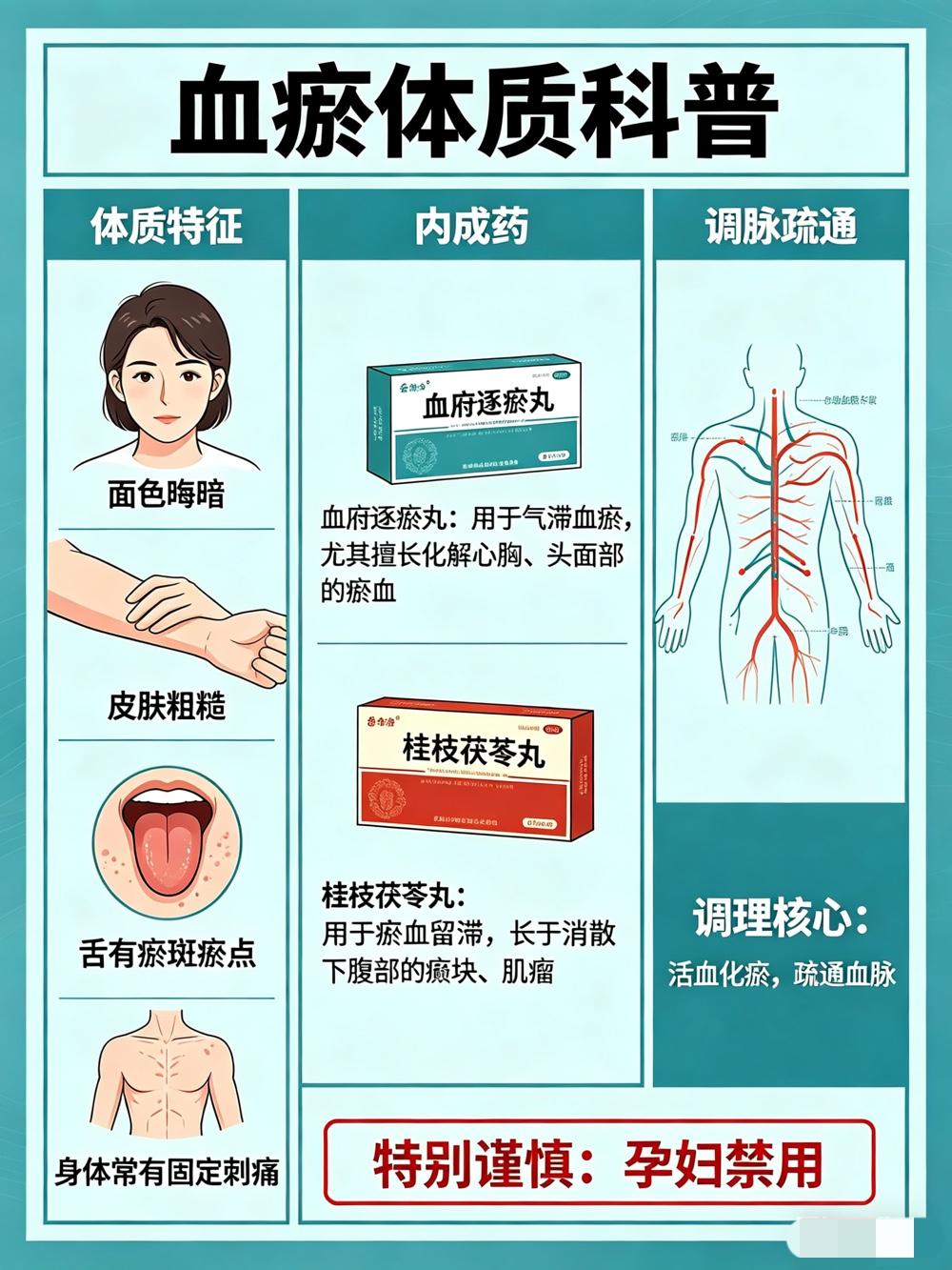 · 调理核心:活血化瘀,疏通血脉。需特别谨慎,孕妇禁用。