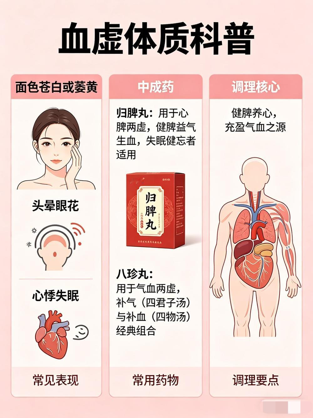 · 归脾丸:用于心脾两虚,通过健脾益气来生血,对伴有失眠健忘者效果较好。