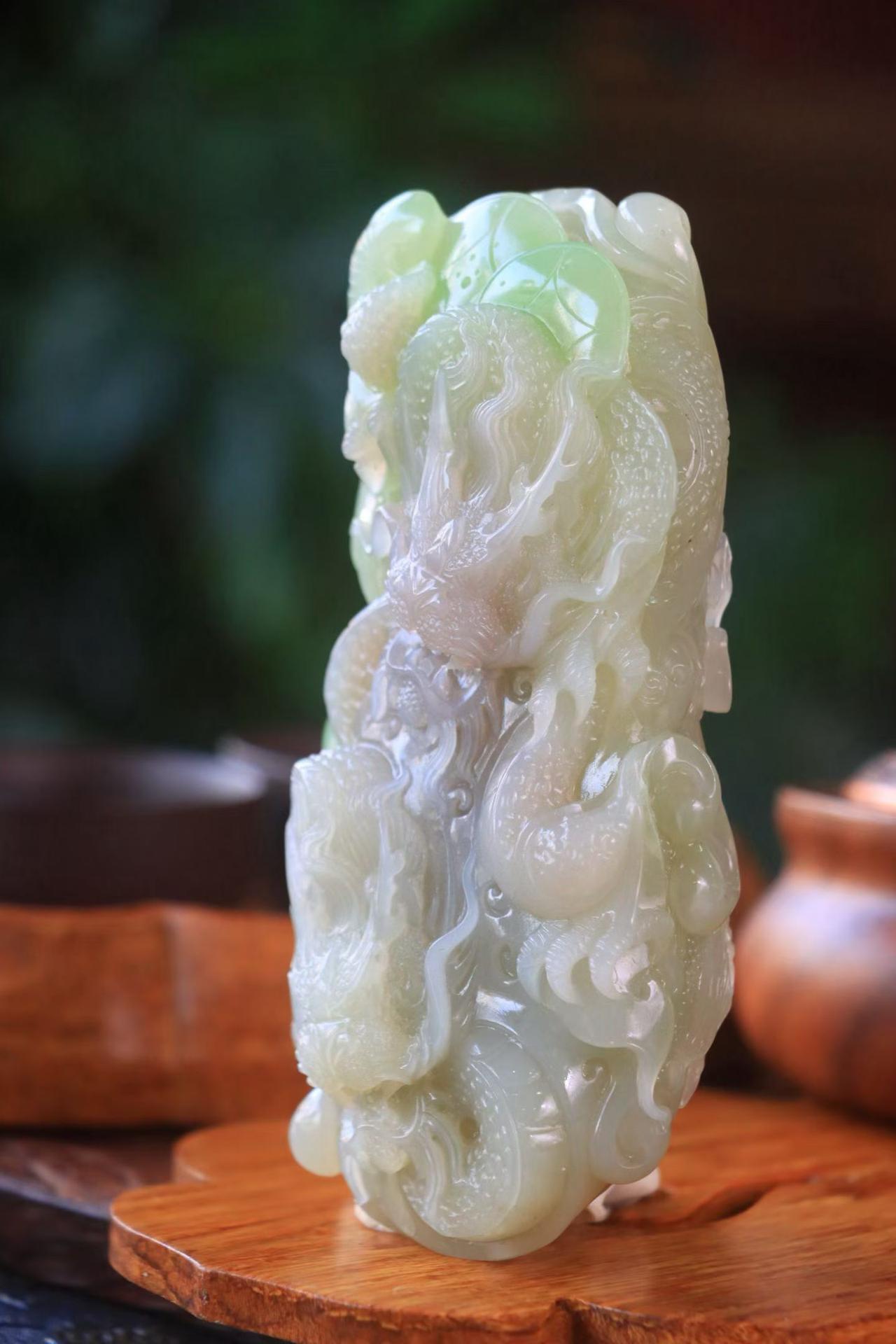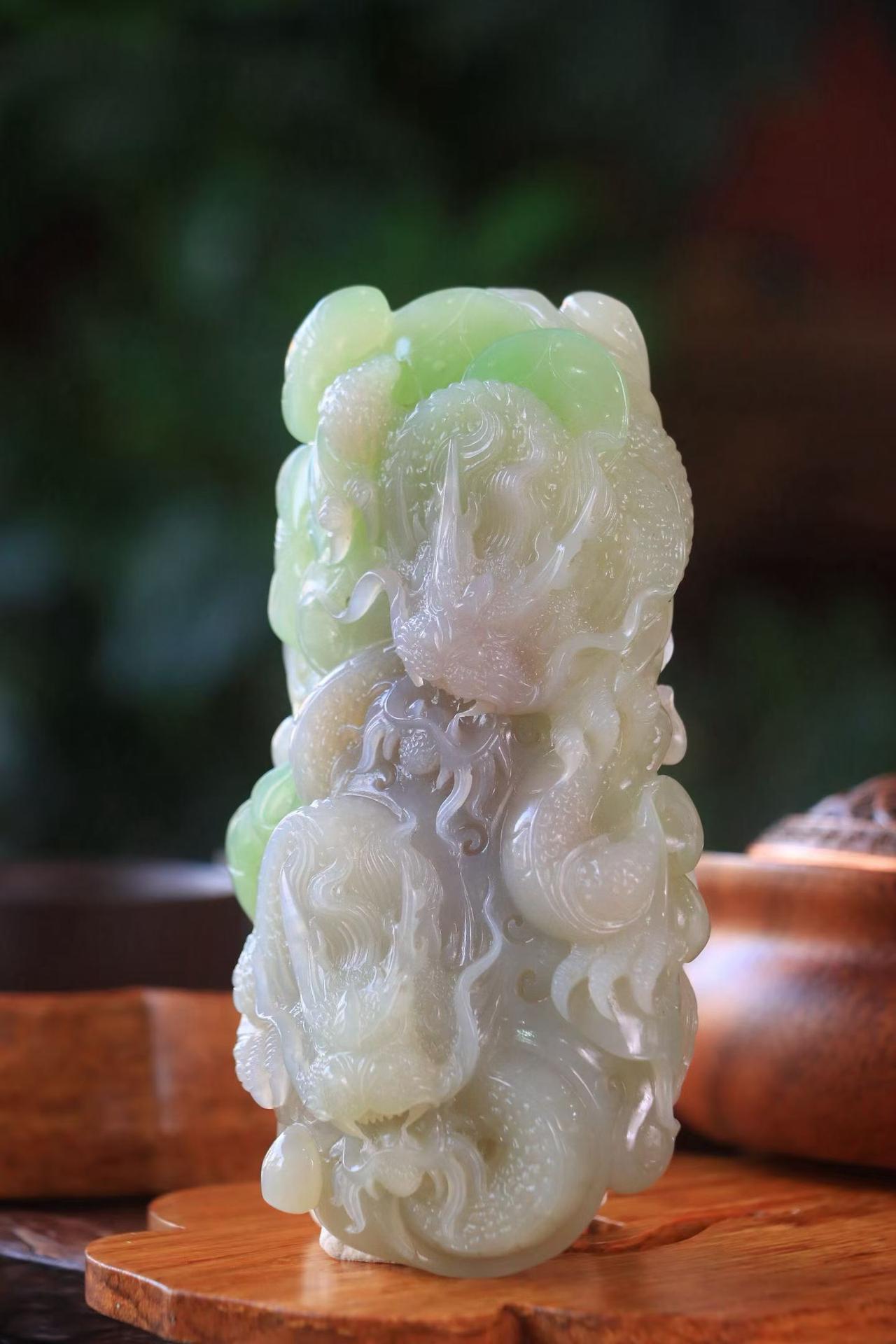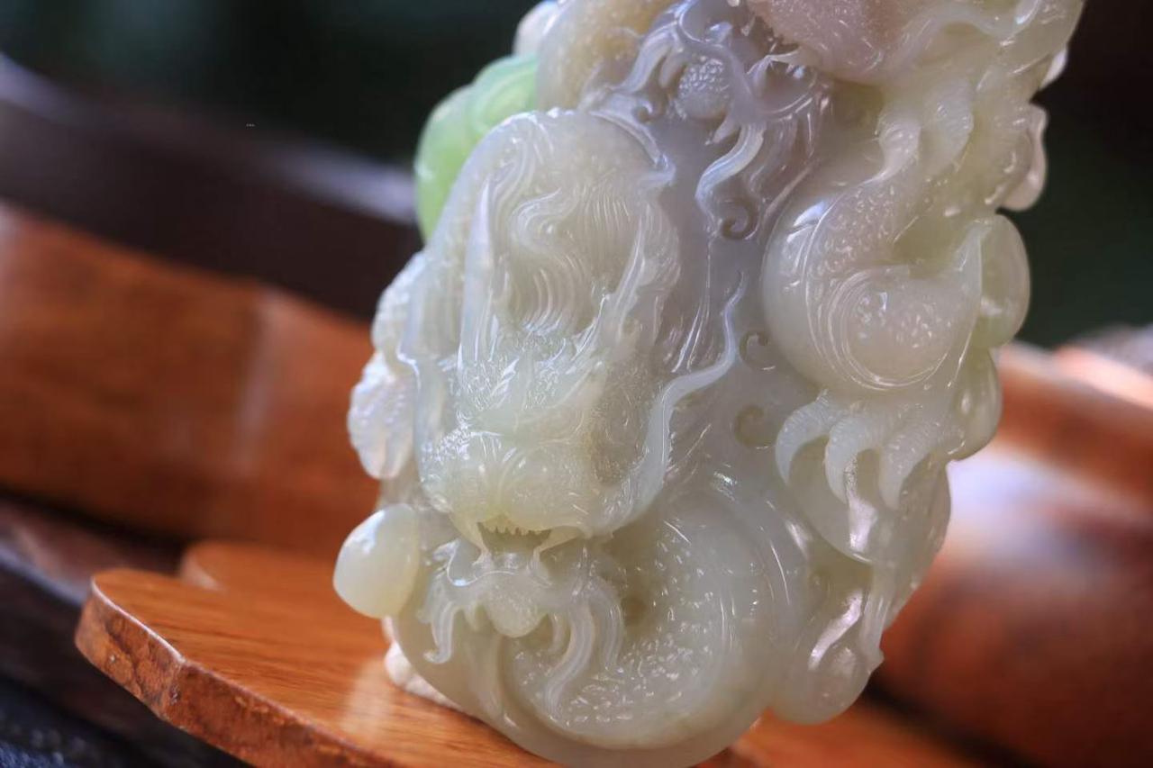 和田玉翠紫老坑料,脂细若膏,温润细腻,纯手工一面精雕双龙,神龙腾飞,龙头精雕,其双目圆瞪,巨口微张,獠牙毕露,口吐祥瑞,二龙戏珠,有气吞万里之感,整器大气庄重,古韵生辉。龙是中华图腾,象征着吉祥与权贵,守护着财富与地位,寓意龙行天下,神龙守护,前途坦荡。
