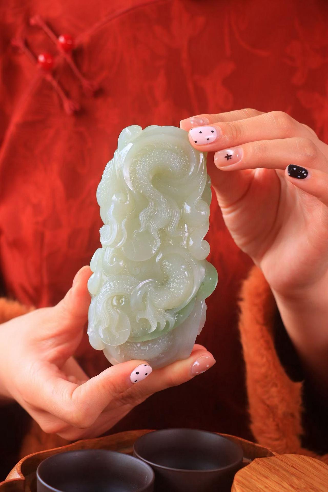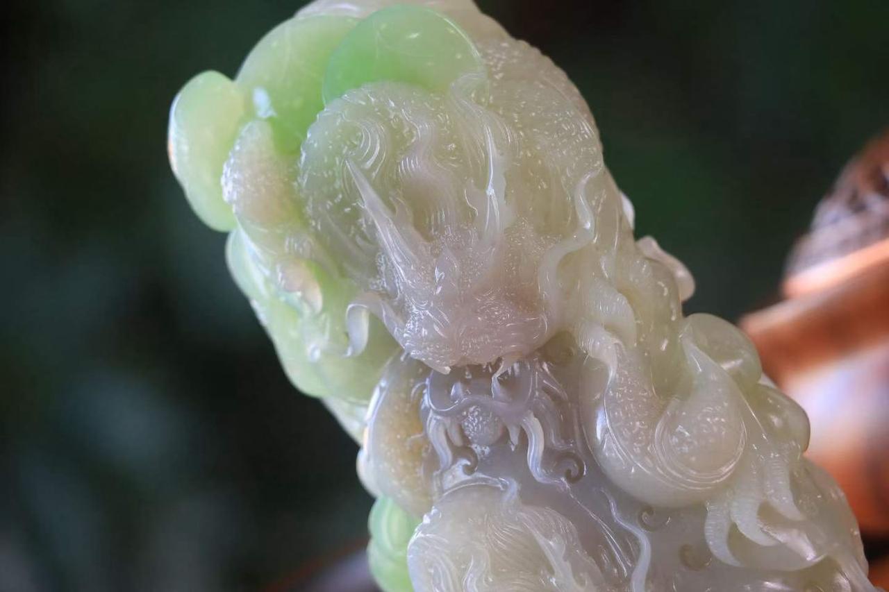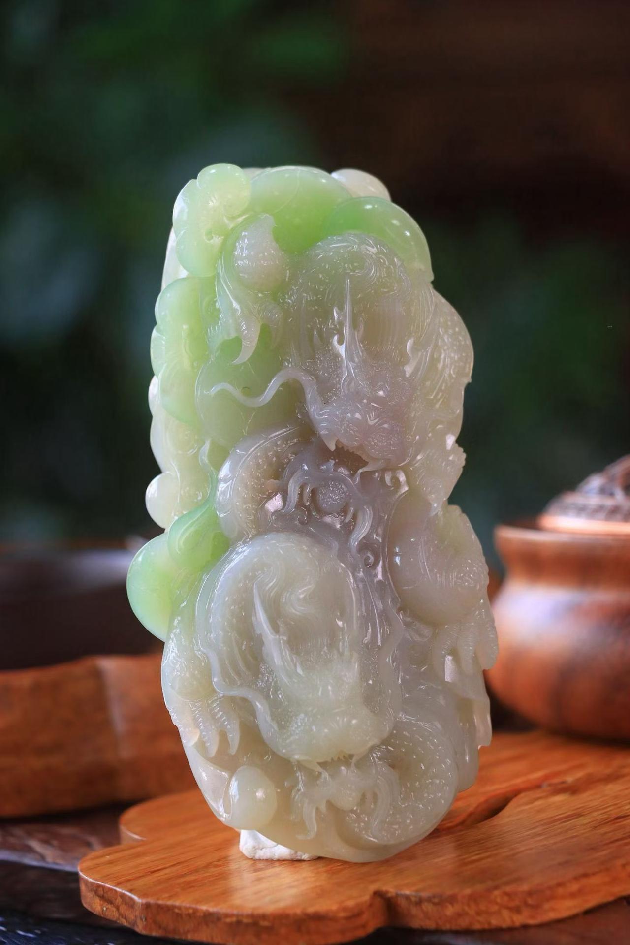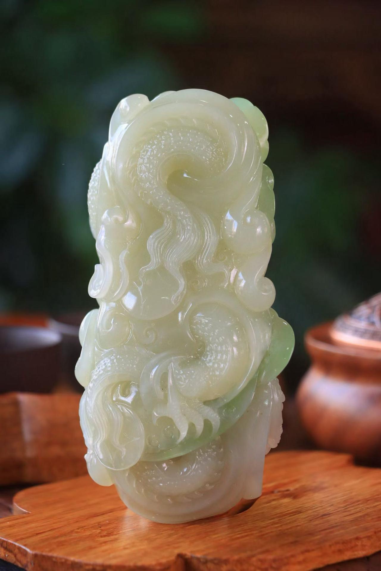 和田玉翠紫老坑料,脂细若膏,温润细腻,纯手工一面精雕双龙,神龙腾飞,龙头精雕,其双目圆瞪,巨口微张,獠牙毕露,口吐祥瑞,二龙戏珠,有气吞万里之感,整器大气庄重,古韵生辉。龙是中华图腾,象征着吉祥与权贵,守护着财富与地位,寓意龙行天下,神龙守护,前途坦荡。