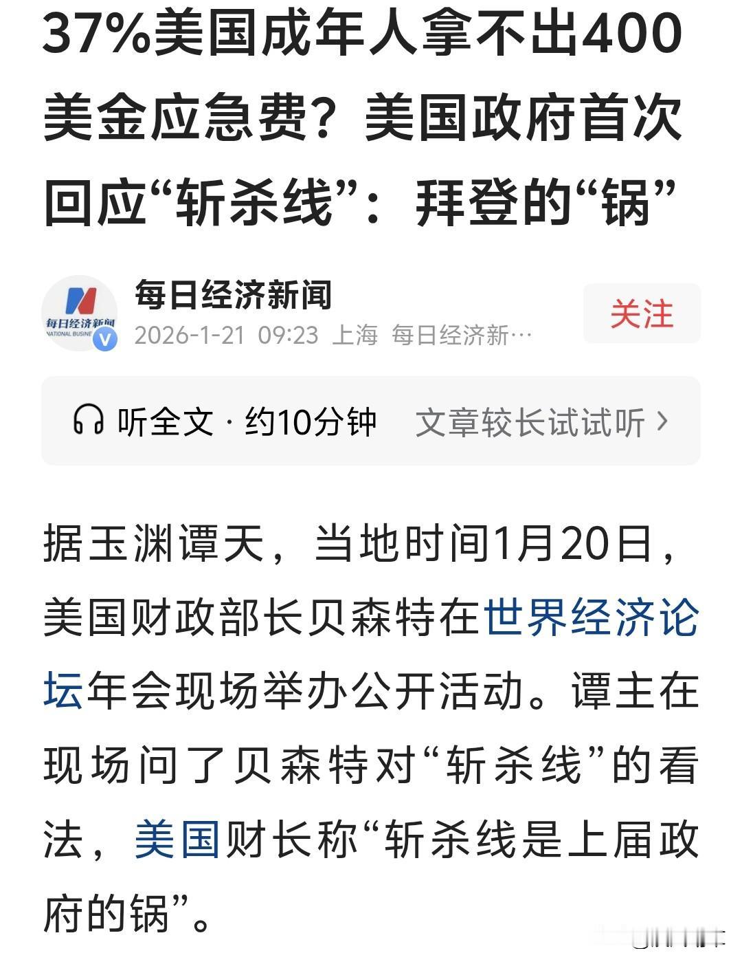 美国财长贝森特就亲口承认,37%的美国人,连400美元的应急费都拿不出来!