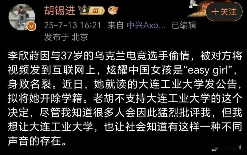 还有那个大连工业大学的李同学,因为媚外事件被学校开除,老胡也表示了坚决的反对,要求学校收回决定,他给出的理由是“让学校和社会知道有一种不同的声音存在”!