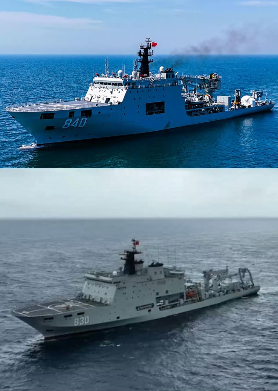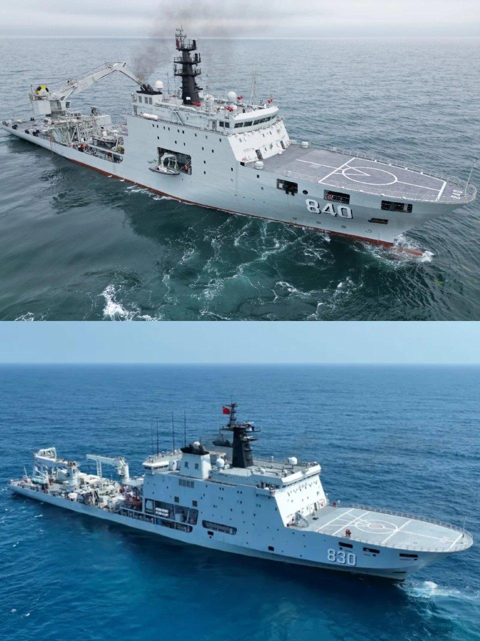 我军两款新型潜艇救援舰同角度对比!840船为缩小简配版,船艉门架取消,不带深潜救生艇。