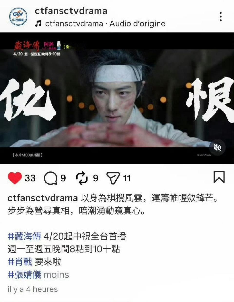 肖战藏海传4.20起上星台湾中视黄金档(台湾三大电视台之一)🐮