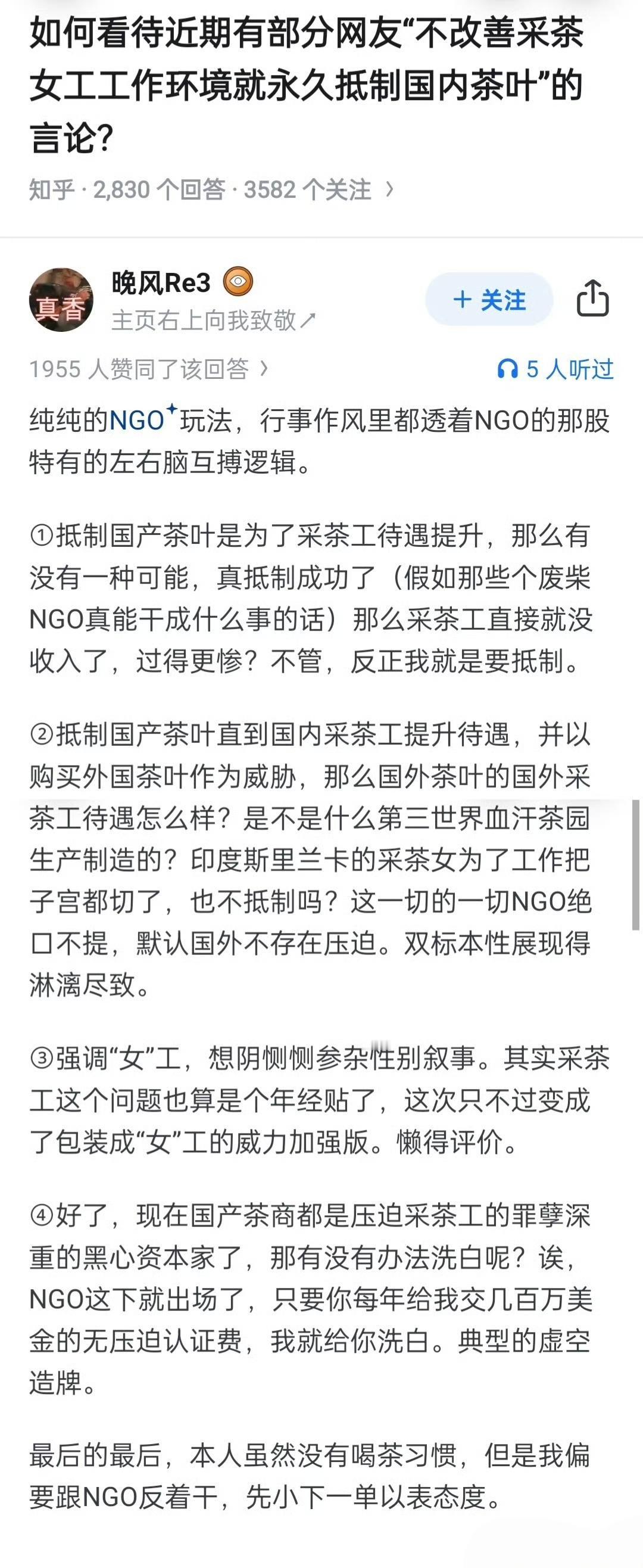 她们根本不在乎采茶女工的真实处境。要是真关心,就该呼吁改善茶区的劳动条件,比如提供防晒装备、减轻劳动强度,而不是让大家抵制国产茶叶,断了女工们的生计。