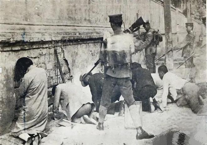 照片中,数名手无寸铁的沈阳平民被日军强行逼迫,面朝斑驳的墙壁屈膝下跪,脊背佝偻,头埋得极低,连抬头的权利都被侵略者剥夺。他们身处日军的刺刀与枪口之下,每一秒都在死亡的阴影里颤抖,不知道下一秒是否会迎来屠杀。