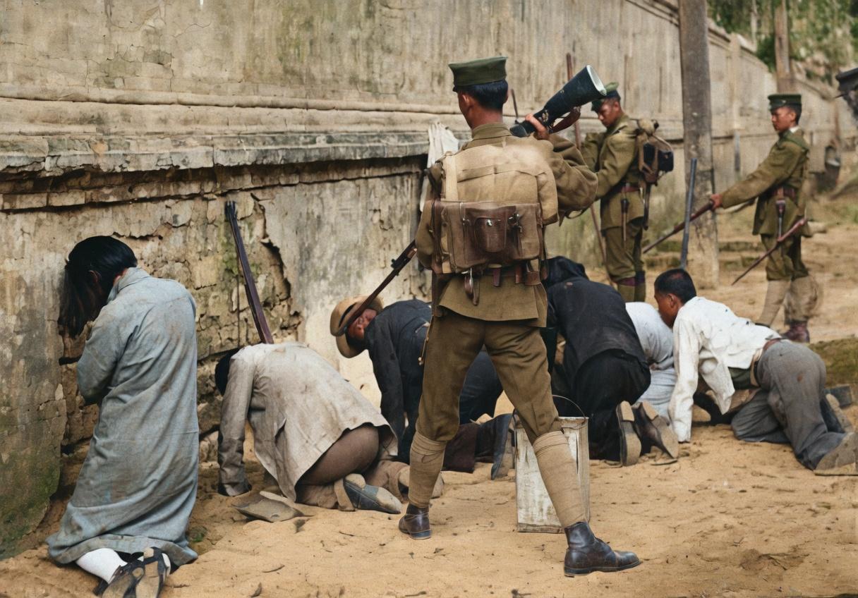 围在一旁的日军嚣张跋扈,一名士兵背对着镜头,手持上了刺刀的步枪,像看管牲畜一样掌控着这些无辜百姓;更远处的日军持着刺刀,随时准备对反抗者下死手。