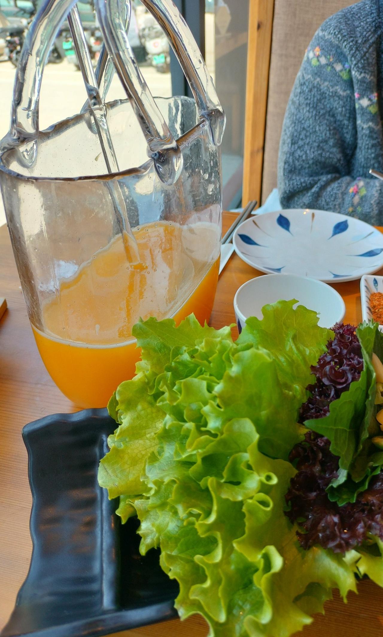 你们见过这个手提包式的玻璃器皿吗? 好看不中用,因为真不如用杯子端上来,直接就可以喝了,这个手提包式的玻璃器皿上边还是交叉式的手提包带,想喝鲜榨芒果汁,还得用这个漏斗式的东西,一点一点的舀出来,放在杯子里,太费劲了,真是多此一举。