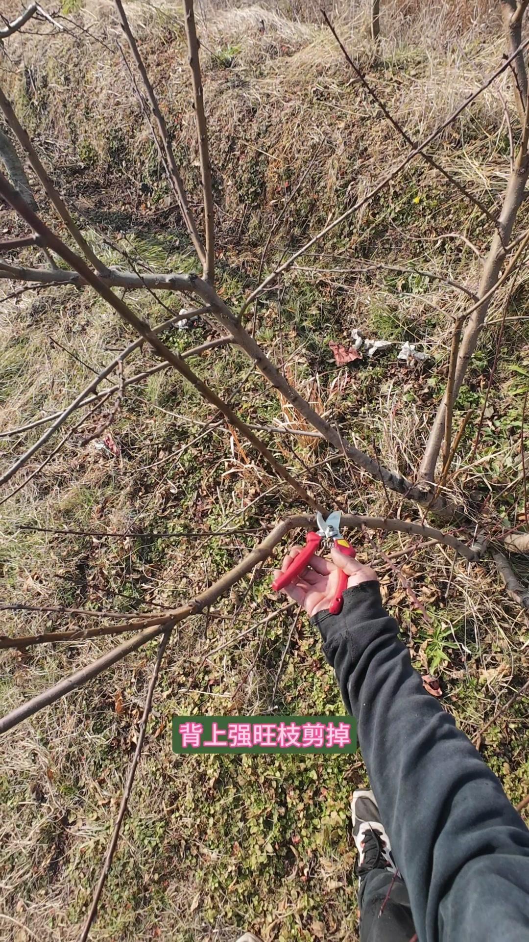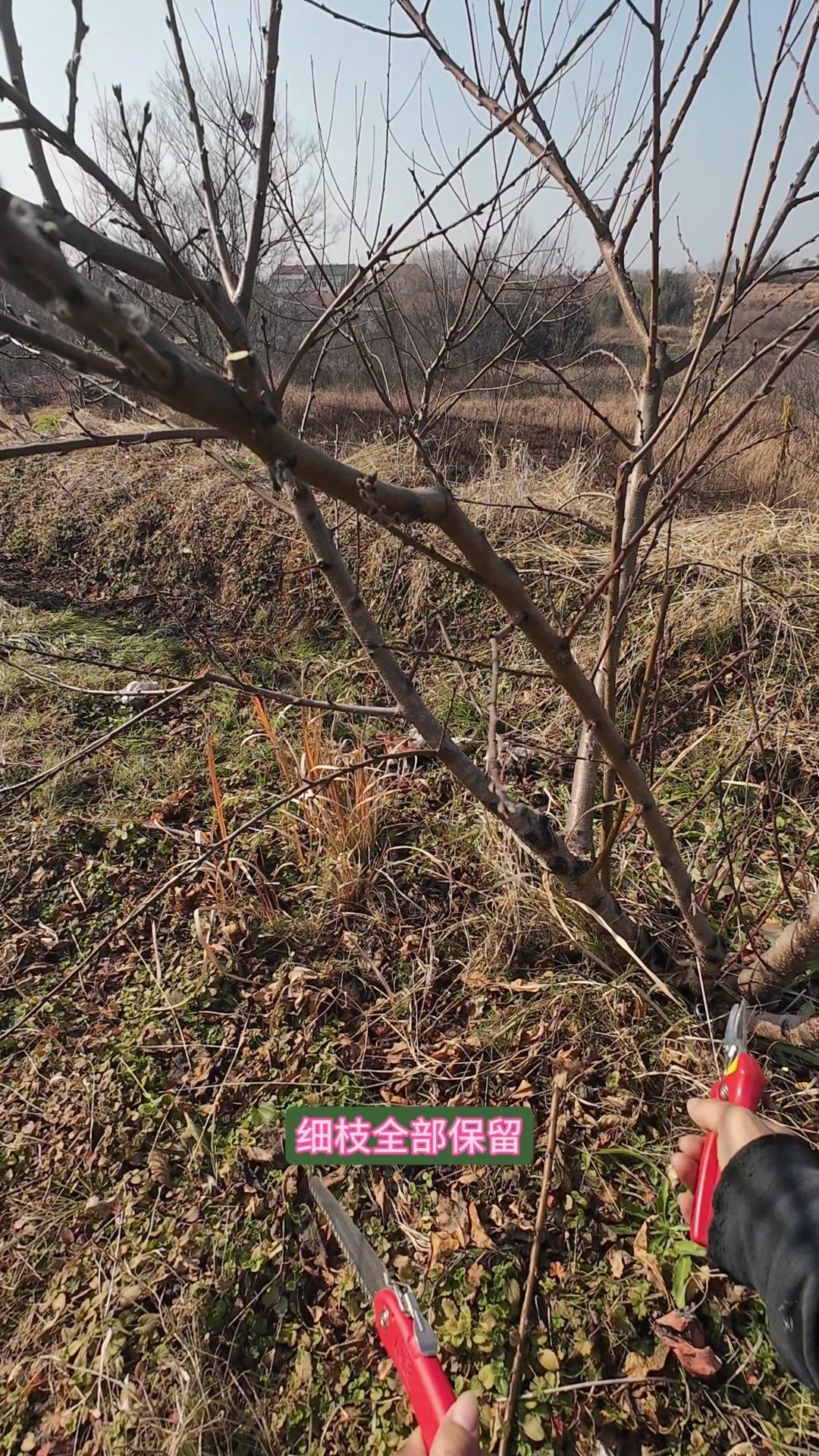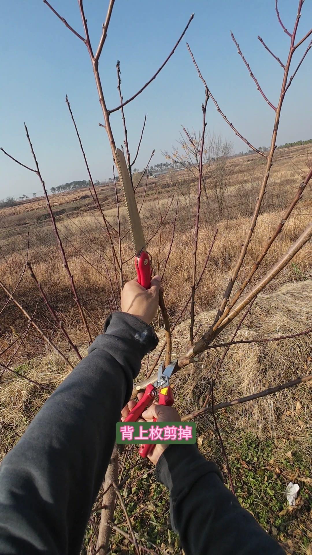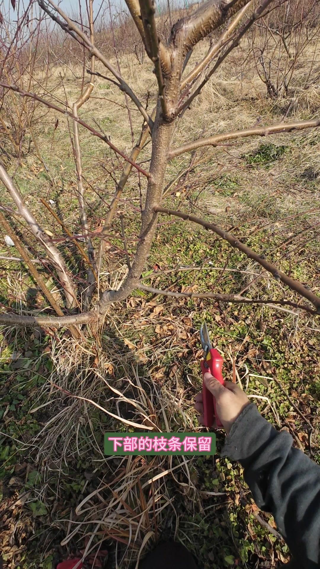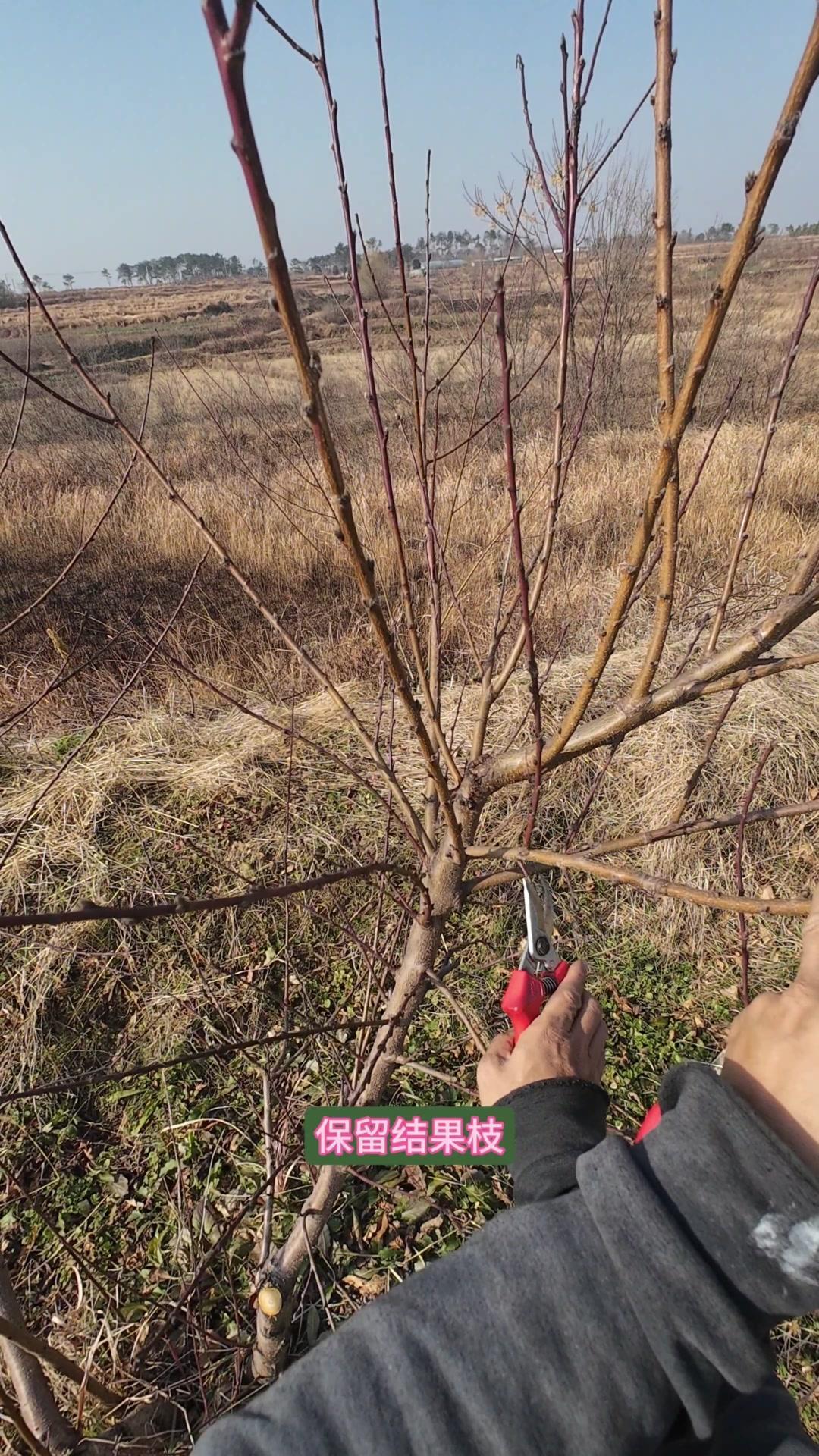 修剪时要先保留结果枝,选留骨架,培养成四主枝开心型。中间直立的粗壮枝要锯掉,主枝角度好的留下。背上强旺枝剪掉,保留单枝向前延伸,下部细枝全部保留。
