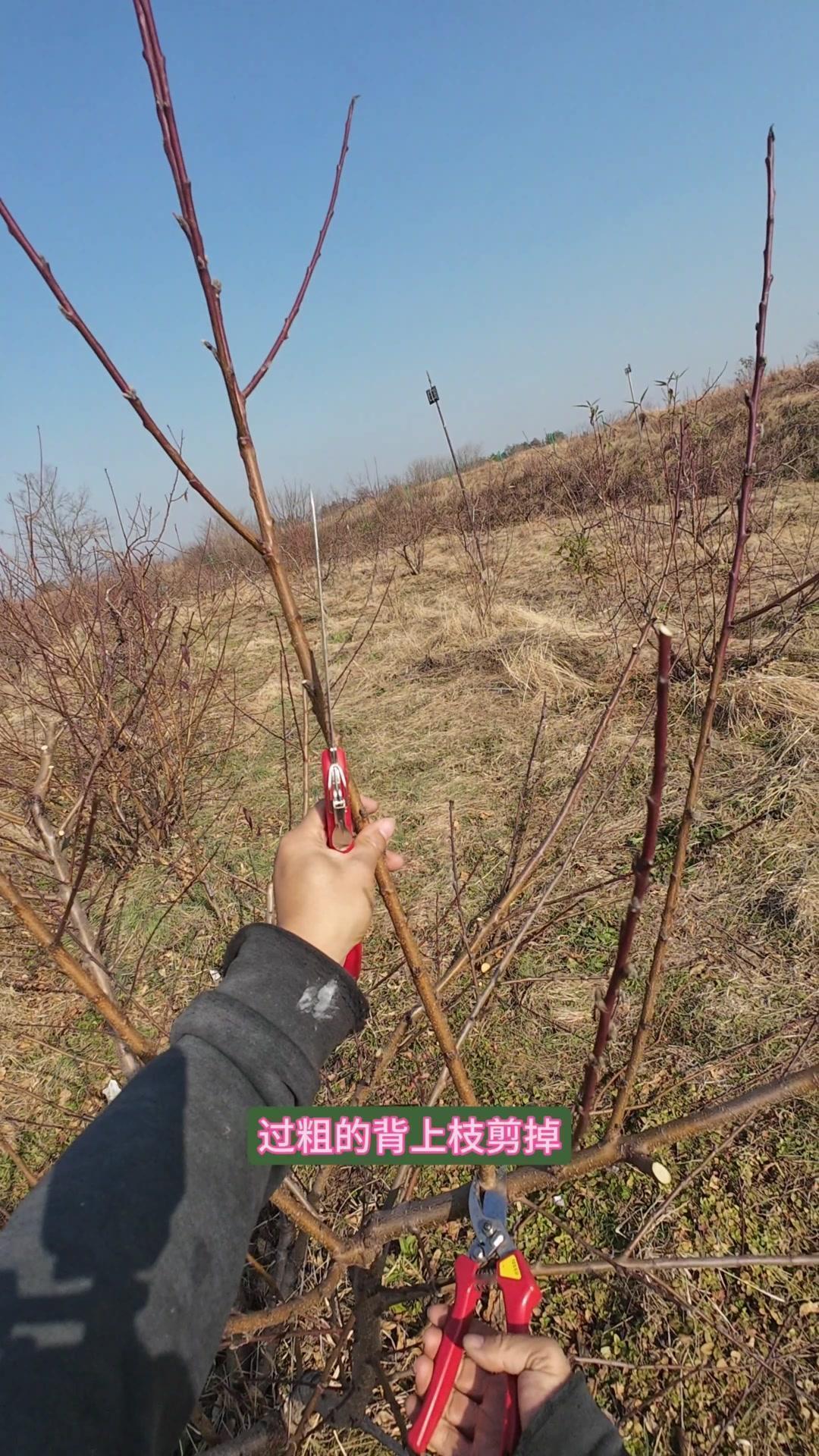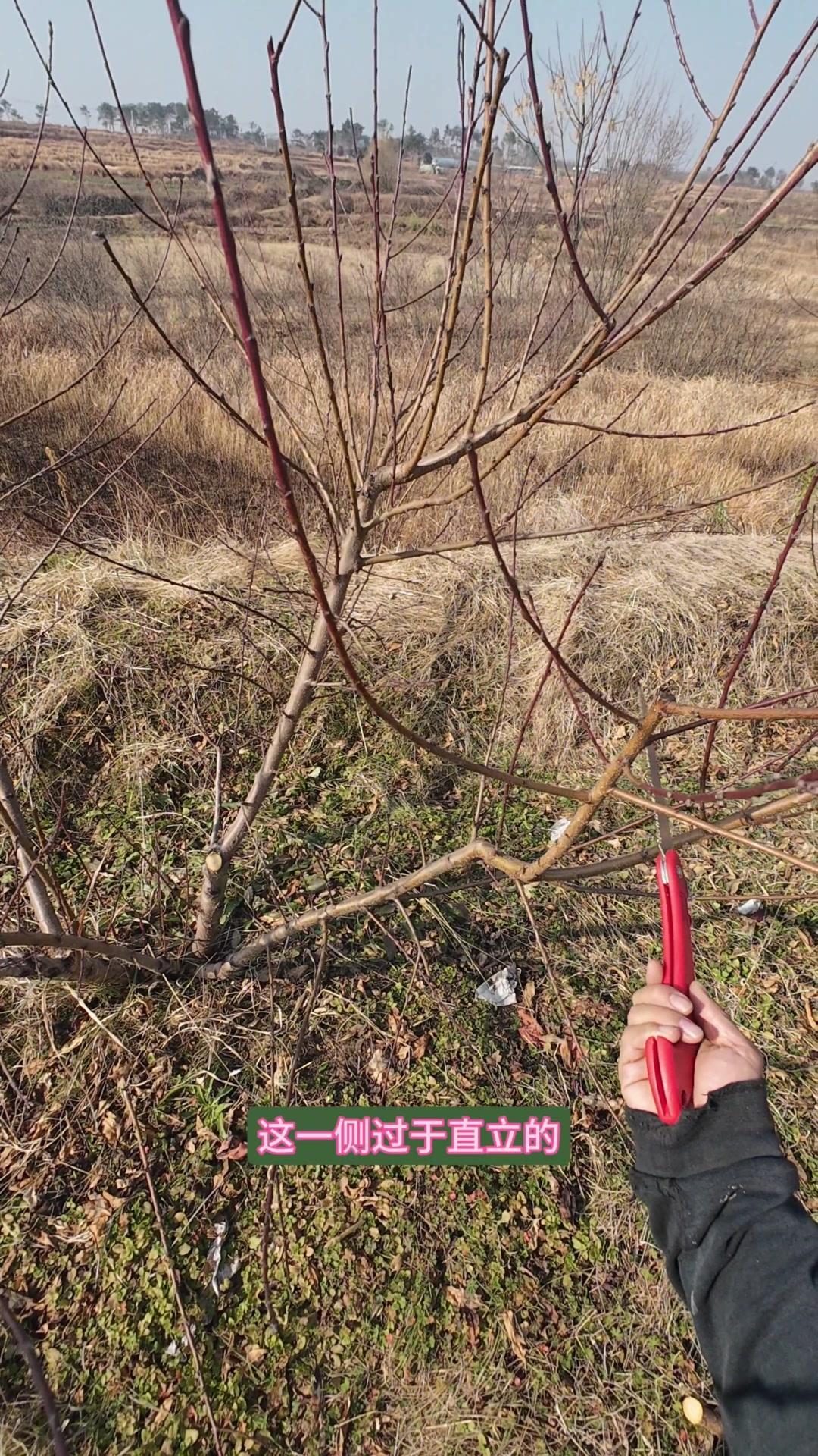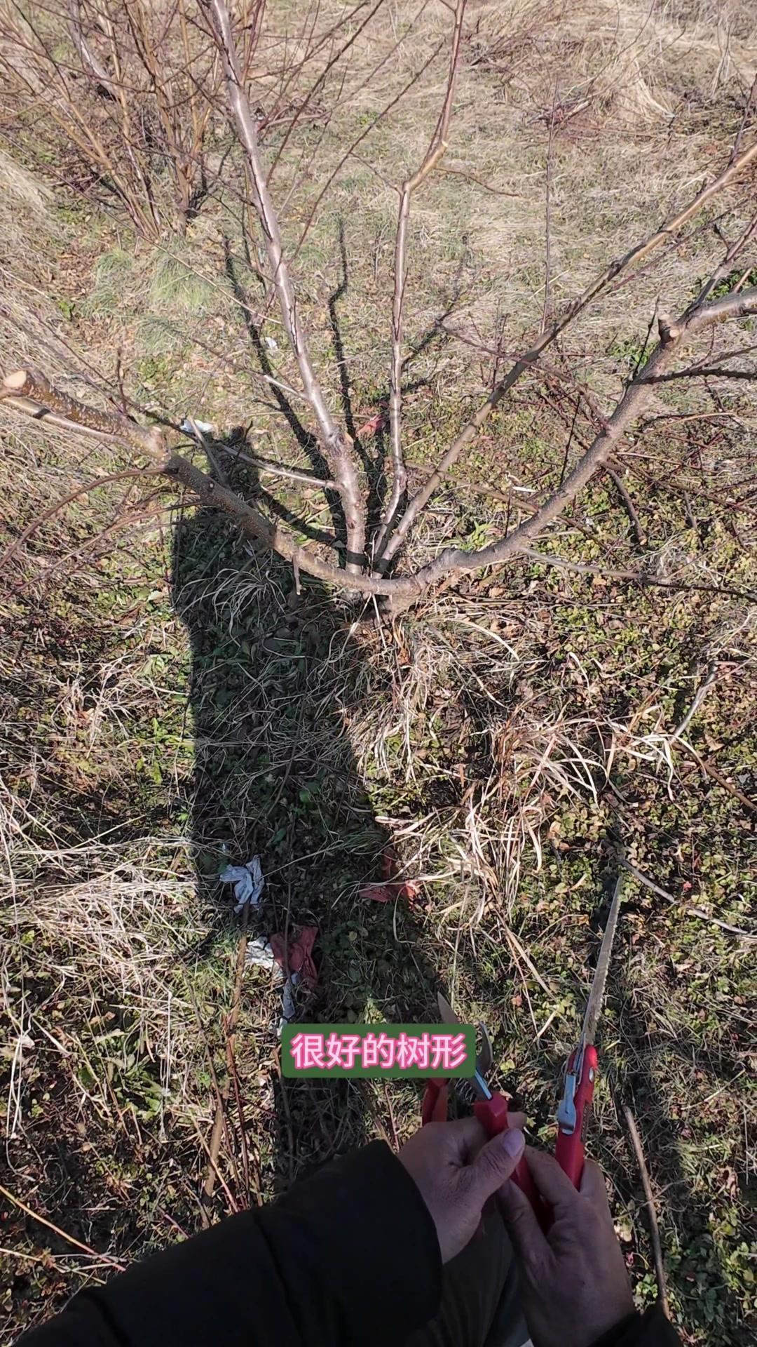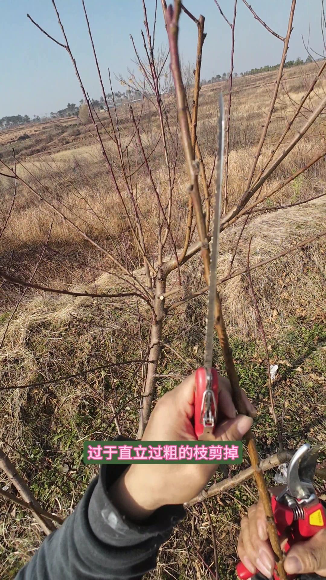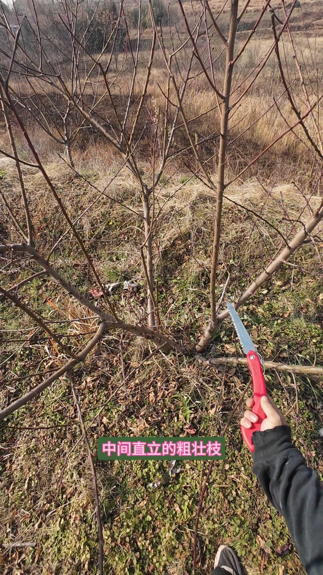 修剪时要先保留结果枝,选留骨架,培养成四主枝开心型。中间直立的粗壮枝要锯掉,主枝角度好的留下。背上强旺枝剪掉,保留单枝向前延伸,下部细枝全部保留。