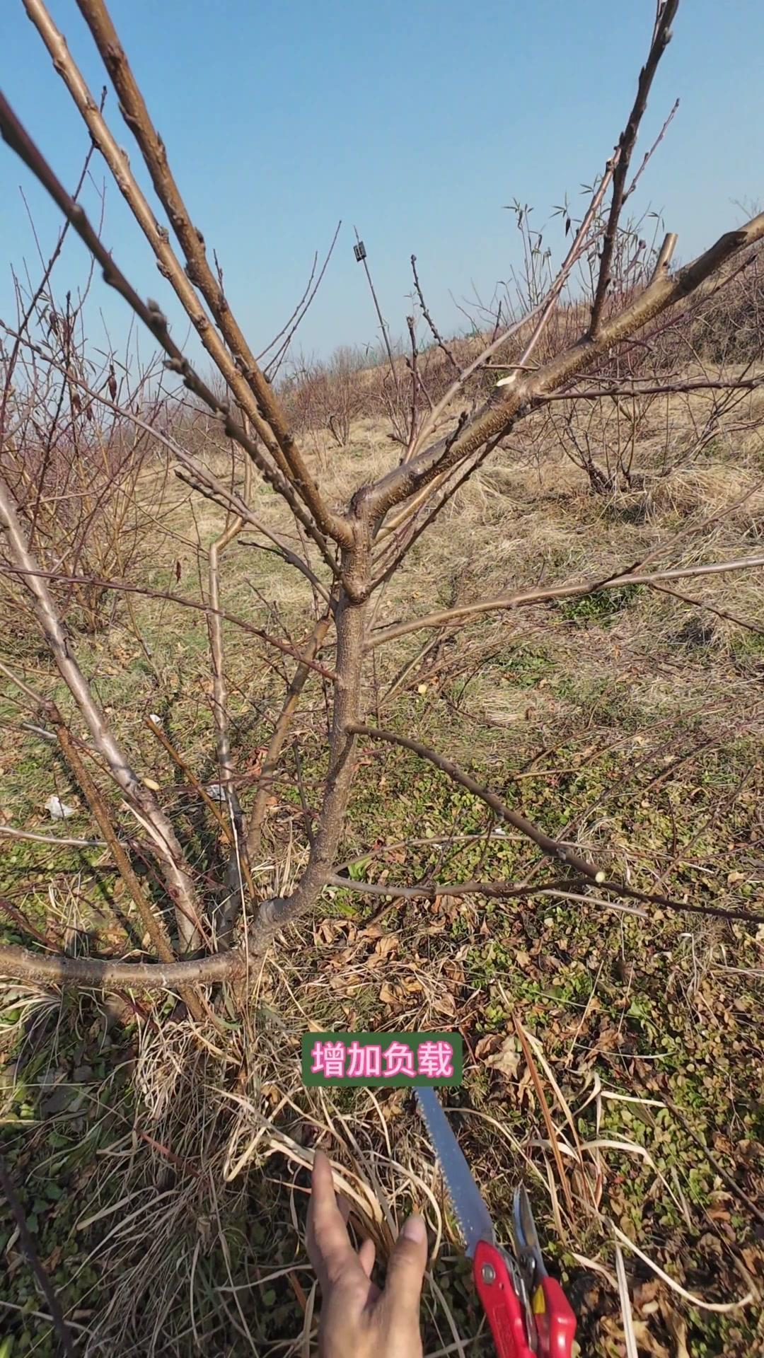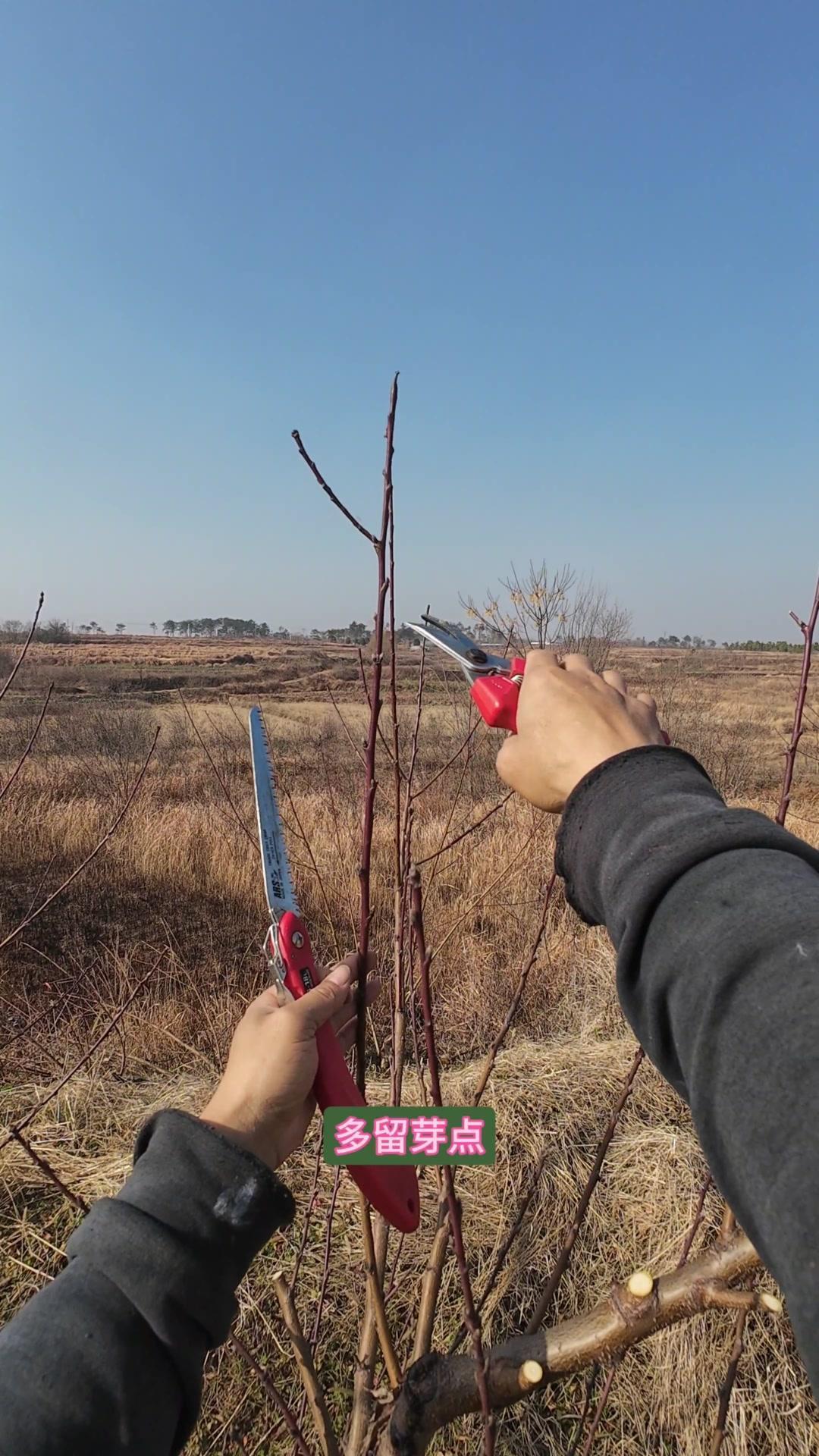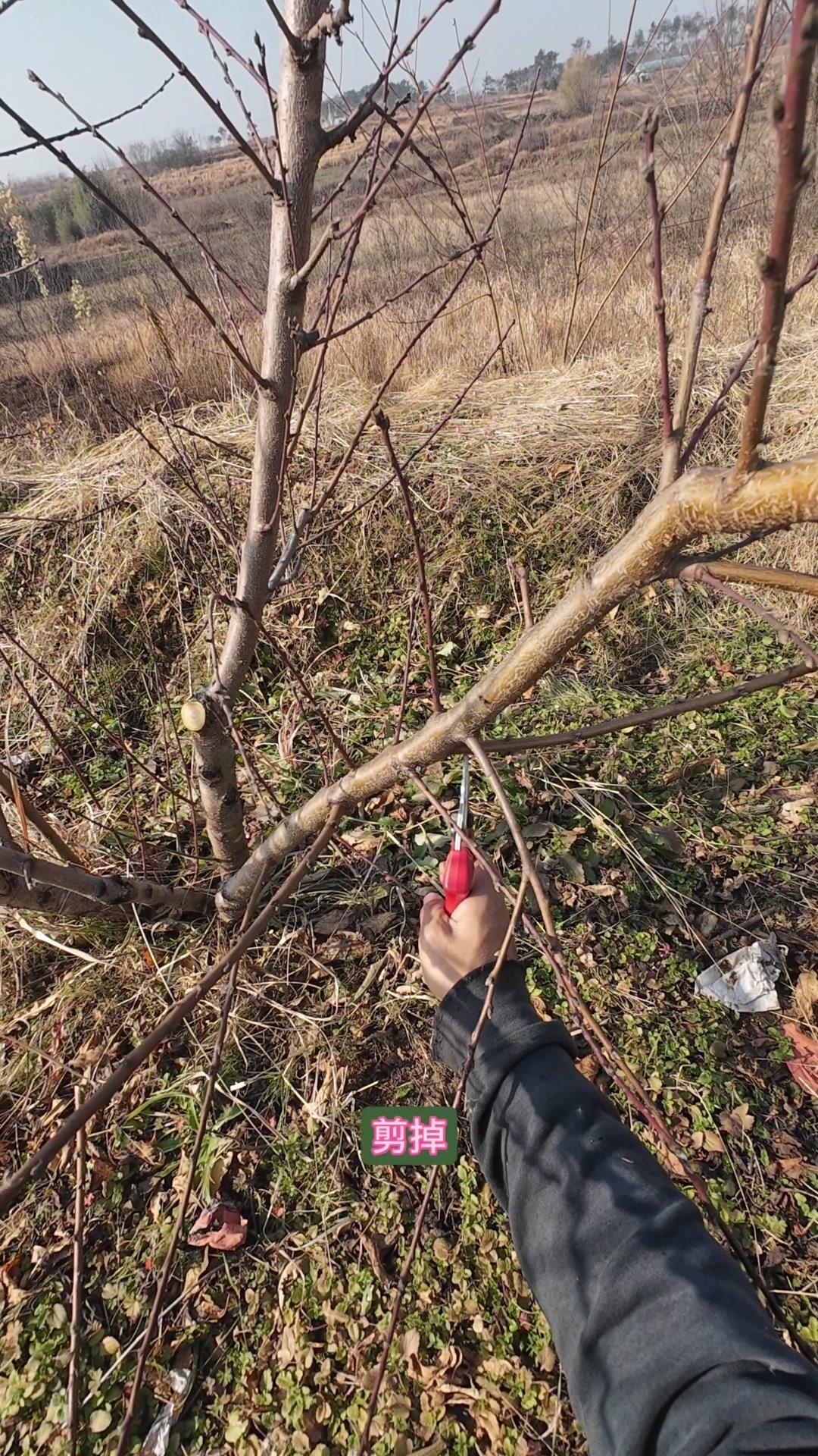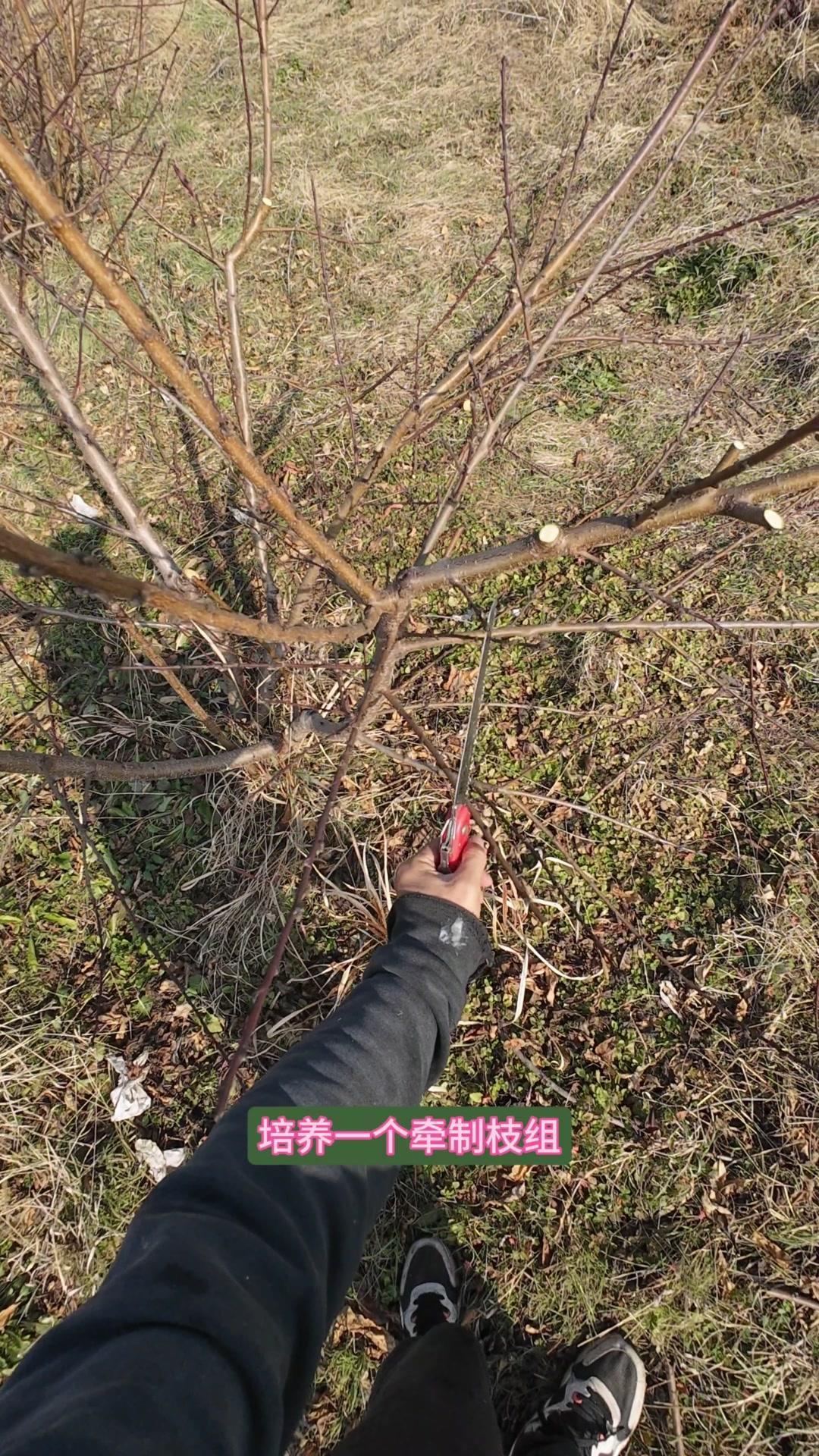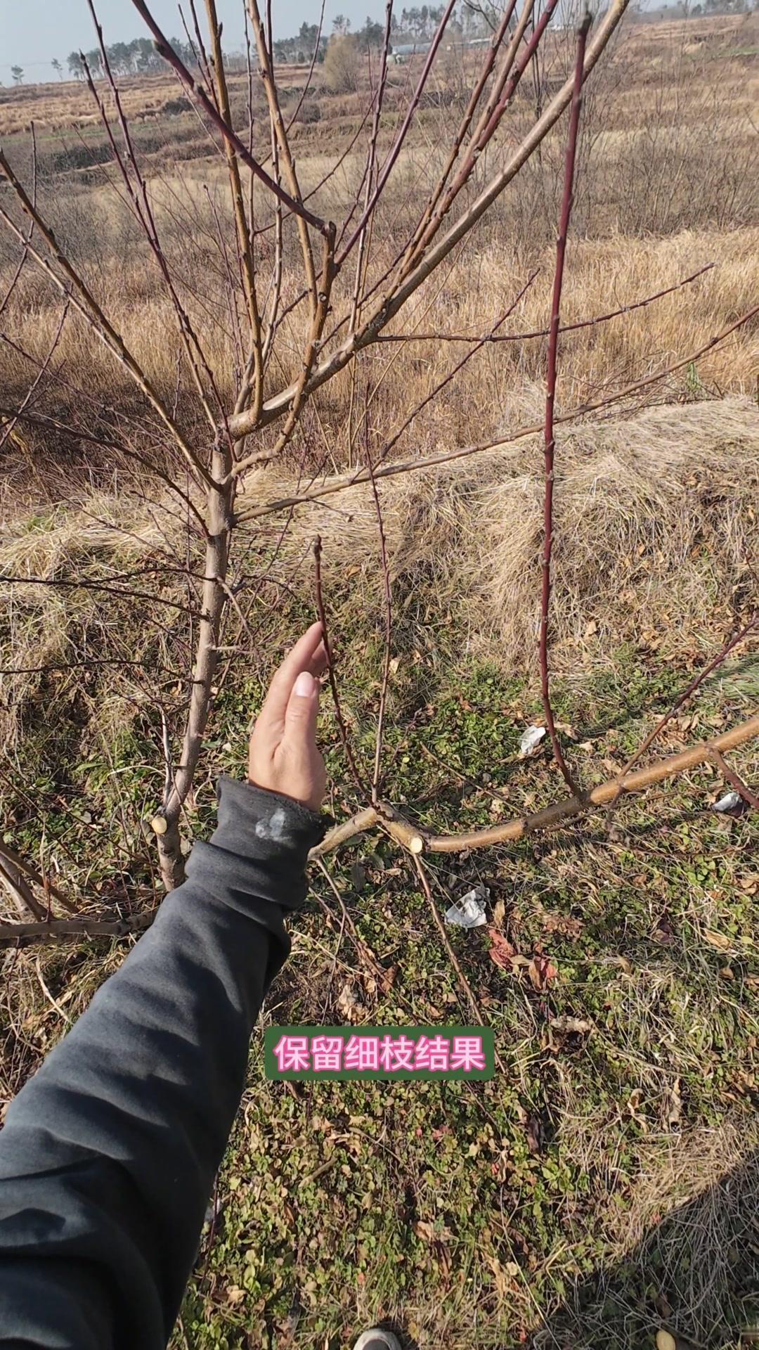 修剪时要先保留结果枝,选留骨架,培养成四主枝开心型。中间直立的粗壮枝要锯掉,主枝角度好的留下。背上强旺枝剪掉,保留单枝向前延伸,下部细枝全部保留。