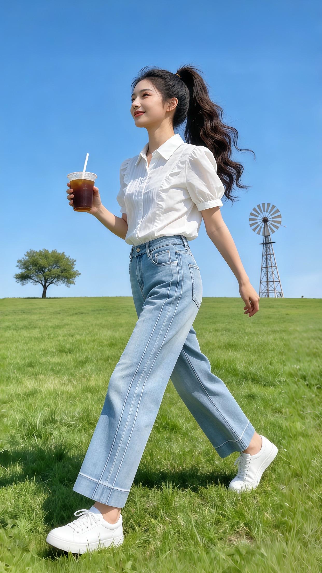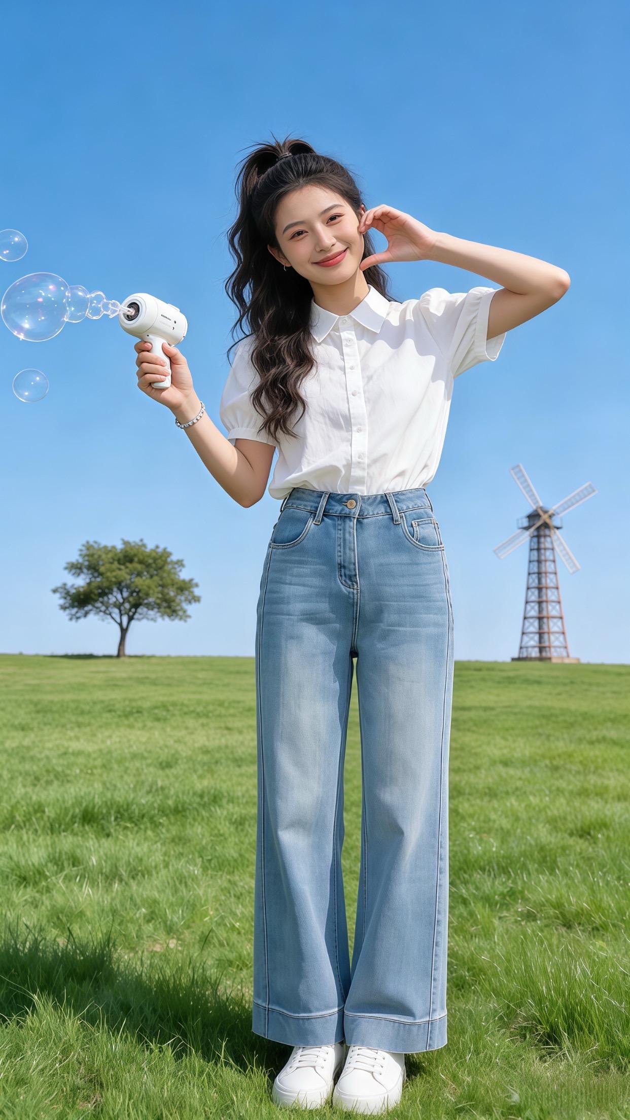 优雅漫步在花丛中,浅蓝色裙摆随风飘动,尽显清新甜美。