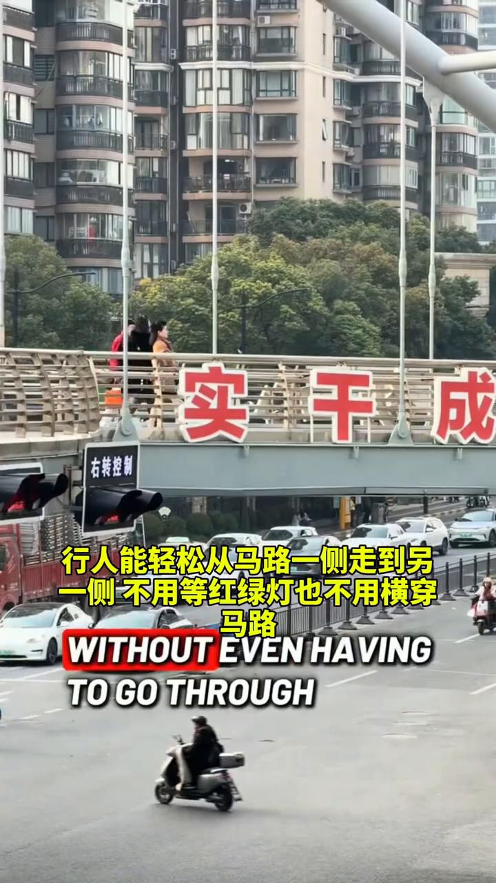 我就是想给大家看看中国日常这些超厉害的工程案例。大家看看这个,这是一条四向街道不用让行人横穿每条六车道的马路。他们建了这座漂亮的四向天桥,桥上还自带交通信号灯。这座四向天桥有通往各个路口的楼梯,中间还有环形区域。行人能轻松从马路一侧走到另一侧,不用等红绿灯也不用横穿马路。