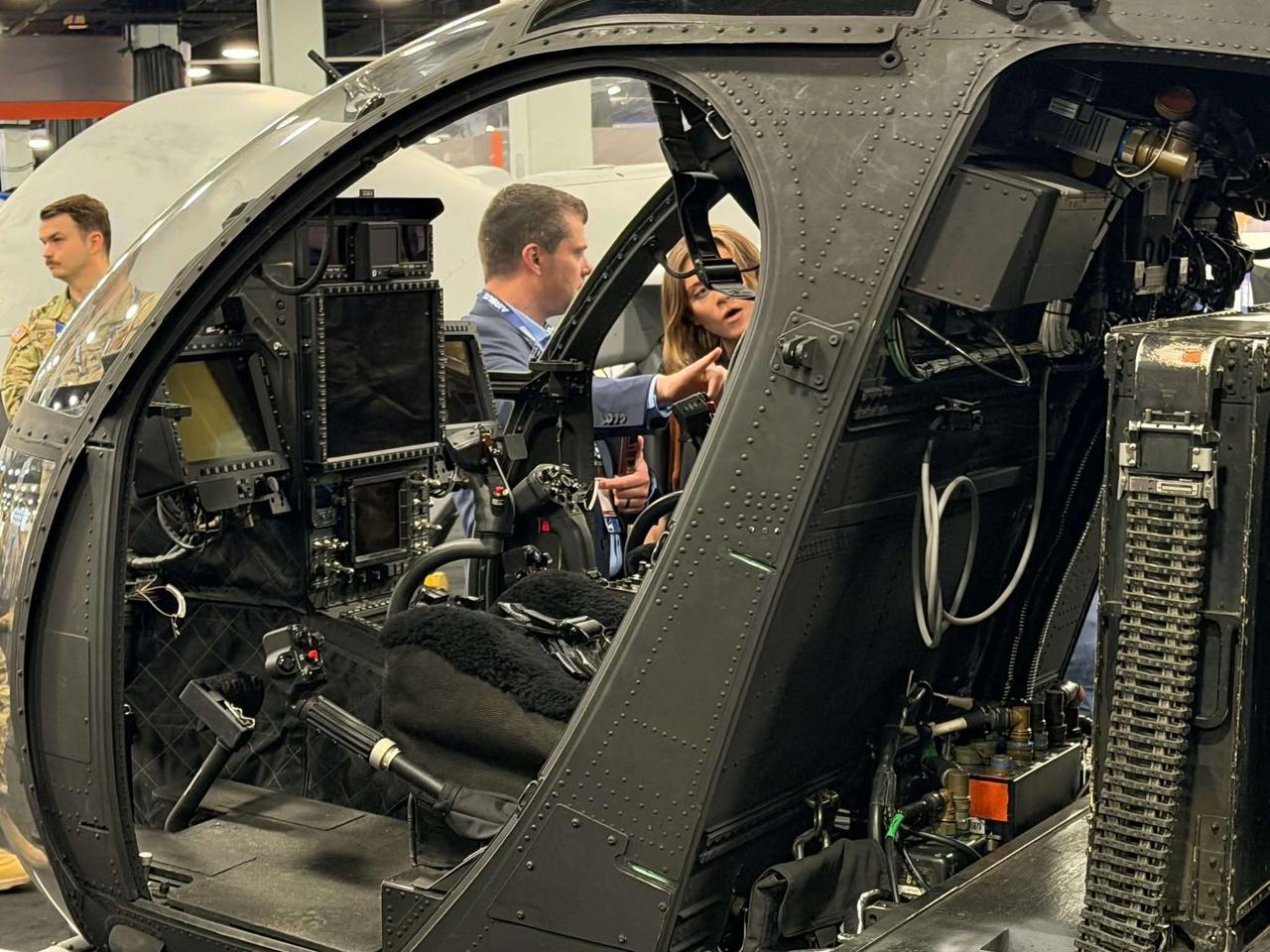 该直升机的驾驶舱内部布局紧凑且设备高度密集,在狭小的机身空间内集成了多块大型多功能显示屏、先进的航空电子设备、复杂的布线系统以及各类“黑盒”组件;拍摄地点似乎位于某场行业展会现场。