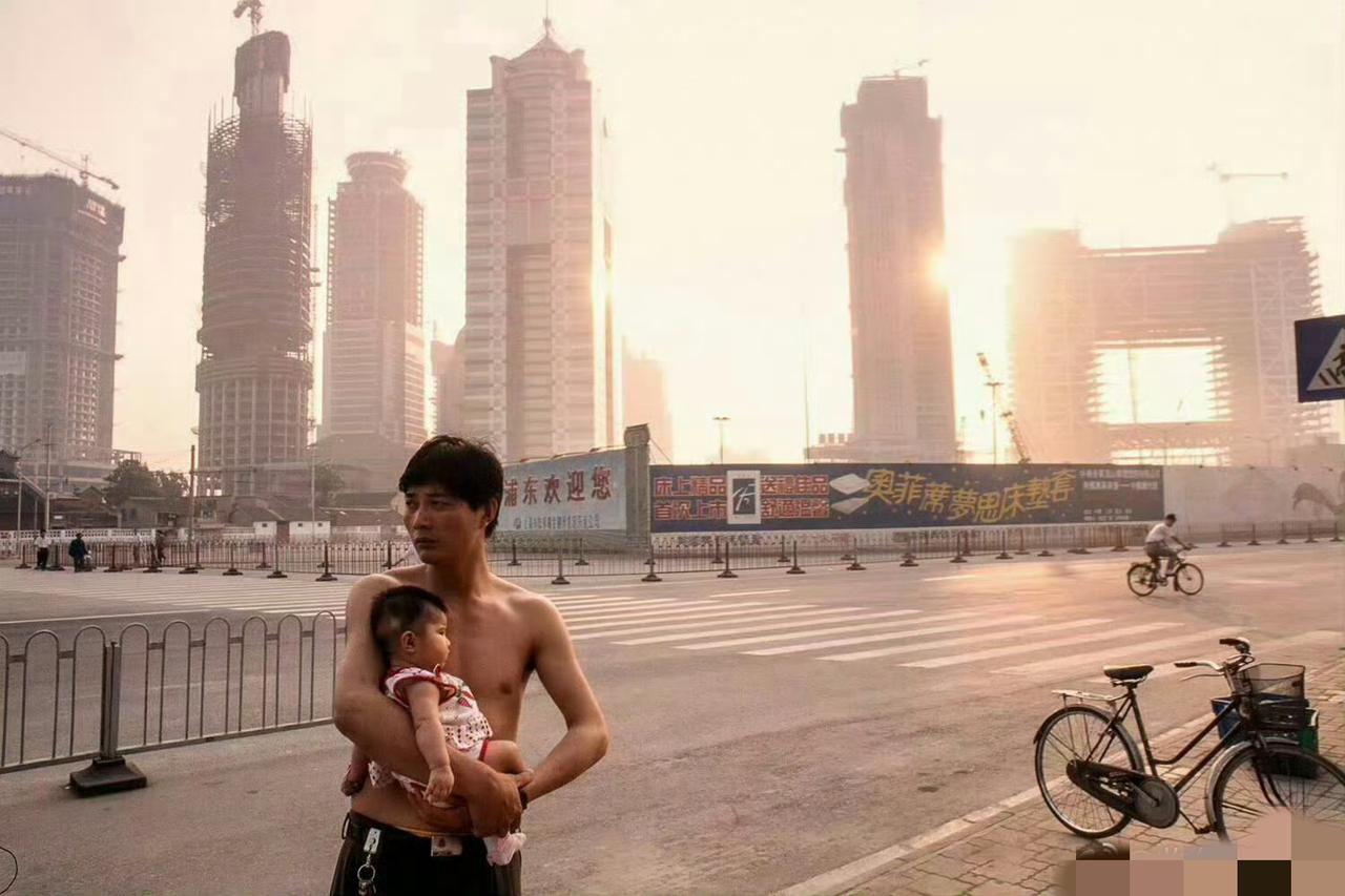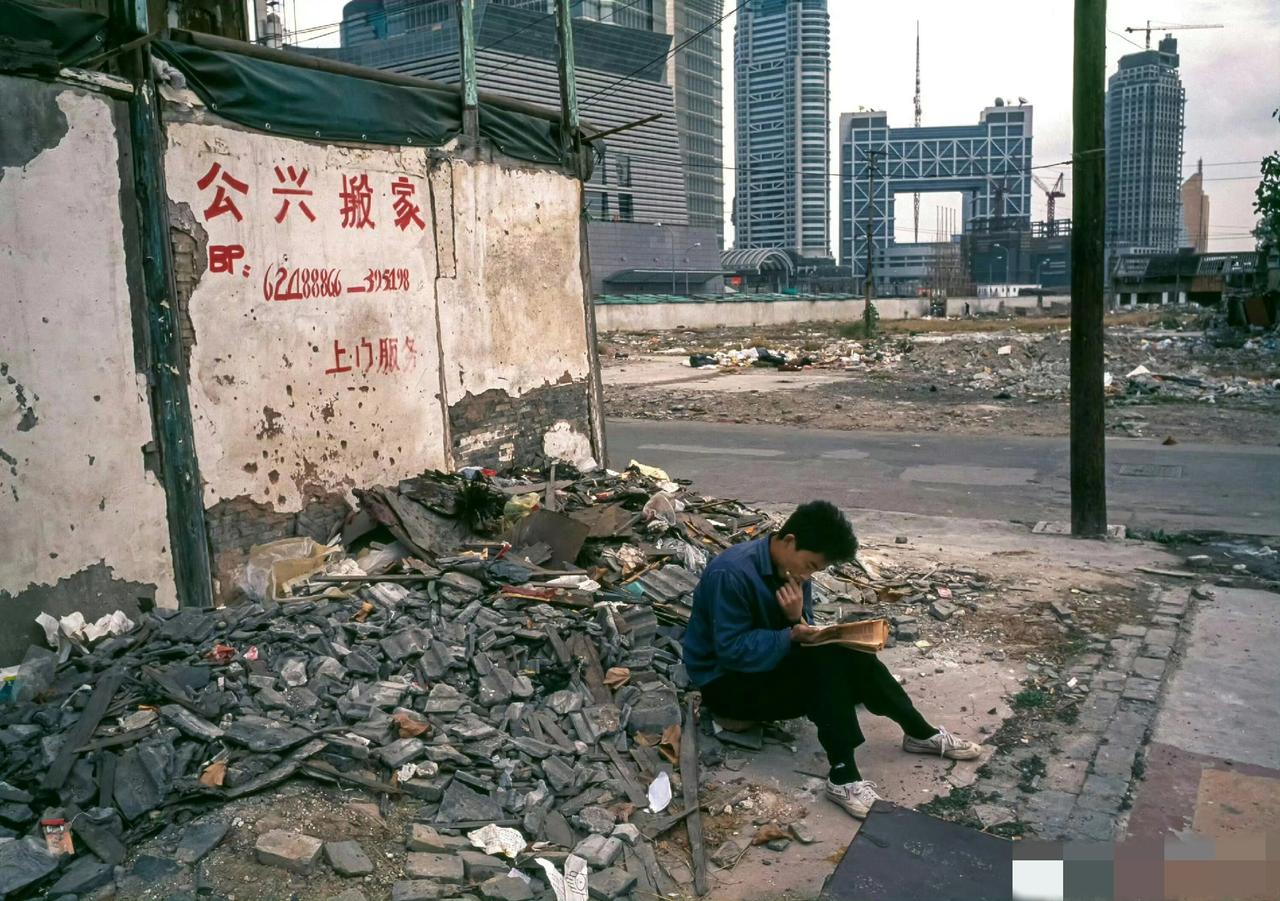 远处陆家嘴高楼还在施工修建,崭新气派的金融大楼刚刚落成,城市正一夜夜发生巨变。可脚下还是破旧拆迁废墟,来往代步全是载重二八大杠自行车,普通人守着拆迁旧房,在尘土里认真生活。
