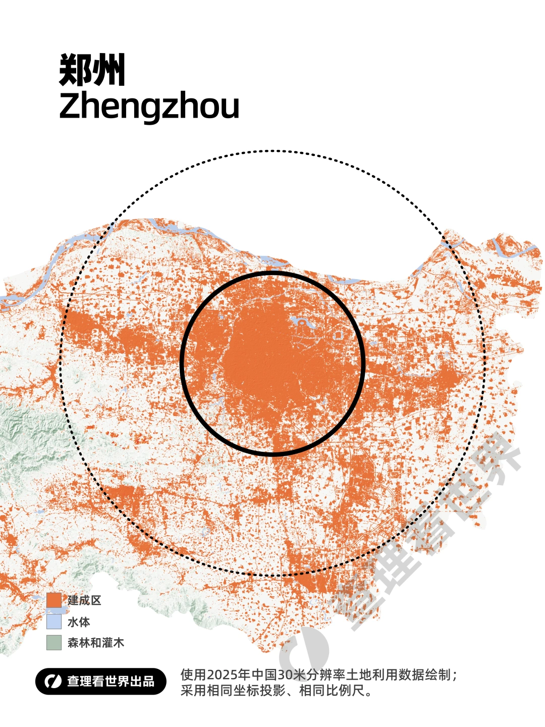 本组地图基于2025 年中国 30 米分辨率土地利用栅格数据绘制,采用统一地图投影与相同比例尺,以完全一致的标准,客观评估黄河流域两大国家中心城市的建成区规模与土地利用现状,并同步呈现北京同尺度对照图,直观展现中部龙头、西北核心与全国标杆的空间格局差异。