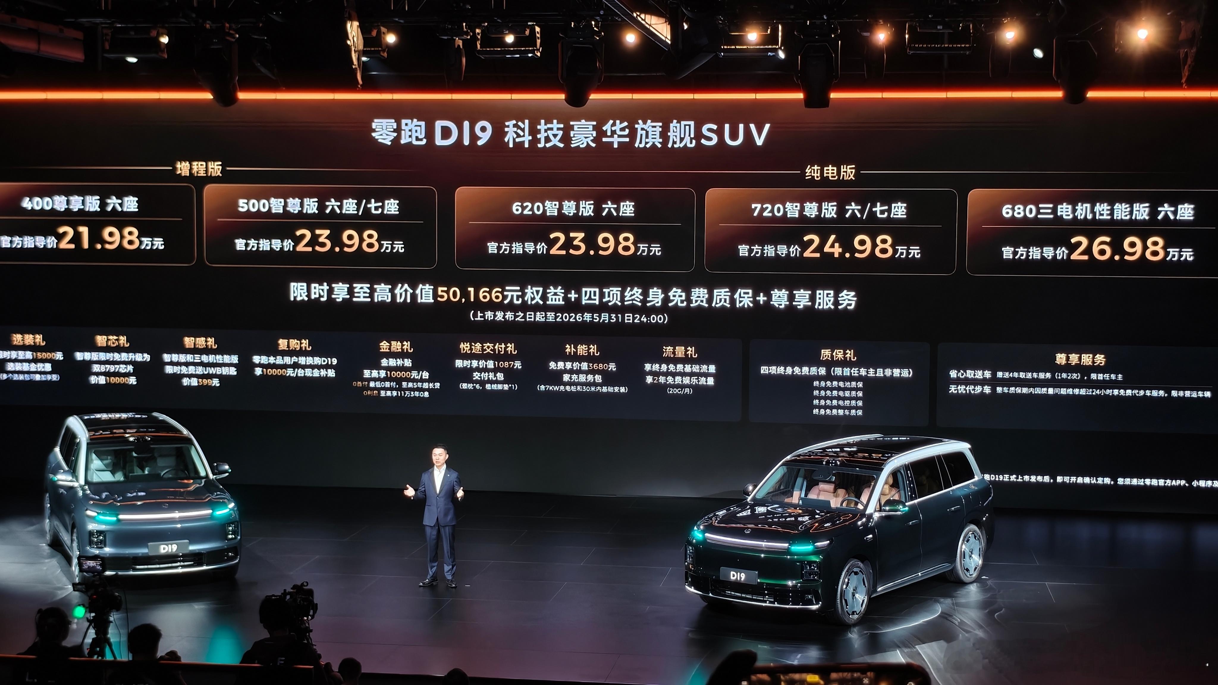 零跑D19价格发布:增程:21.98(400km)~23.98万元(500km)(6座/7座)。两个配置最大差异除了电池容量之外,还差空气悬架、皮质等。六座/七座的区别是:六座有二排右侧零重力座椅,七座可以二三排放平。纯电:23.98(620km)~24.98(720km)~26.98(三电机,其他为双电机)万元。前两个配置基本就差电池容量。三电机版本除了电机外,还有双8797芯片。不过,现在订车,除增程最低配外,都可以免费升级到双8797芯片。政策方面也不错,老车主复购还能再减1W。
