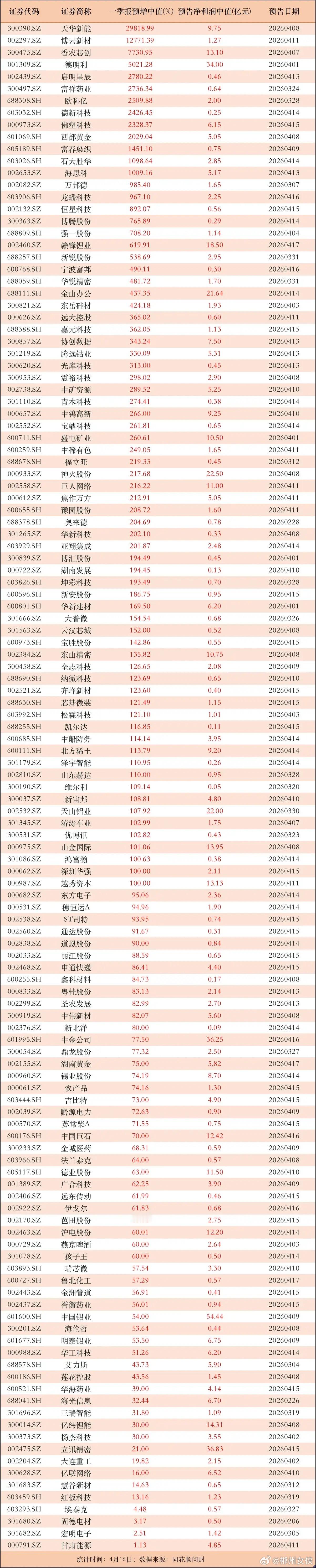 一季报业绩表现亮眼,12家公司一季度预告净利润增幅超1000%!具体名单及预增幅