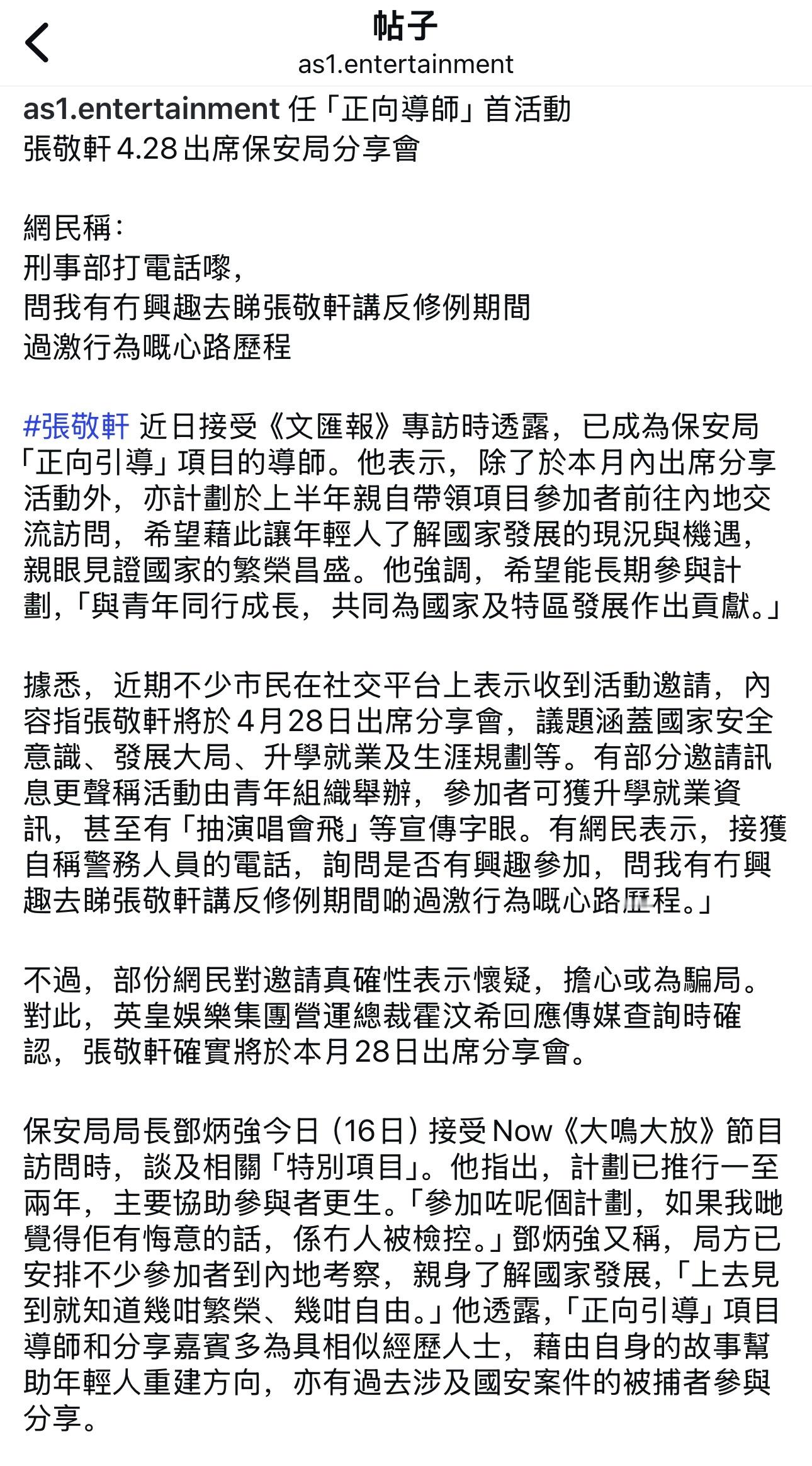 张敬轩任「正向导师」4.28出席保安局分享会。网民称:刑事部打电话来,问有没有兴趣去看张敬轩讲反修例期间过激行为的心路历程.张敬轩近日接受专访时透露,已成为保安局「正向引导」项目的导师。据悉,近期不少市民在社交平台上表示收到活动邀请,内容指张敬轩将于4月28日出席分享会,有网民表示,接获自称警务人员的电话,询问是否有兴趣参加,问有没有兴趣去看张敬轩讲反修例期间过激行为的心路历程。不过,部份网民对邀请真确性表示怀疑,担心或为骗局。对此,英皇娱乐集团营运总裁霍汶希回应传媒查询时确认,张敬轩确实将于4月28日出席分享会。