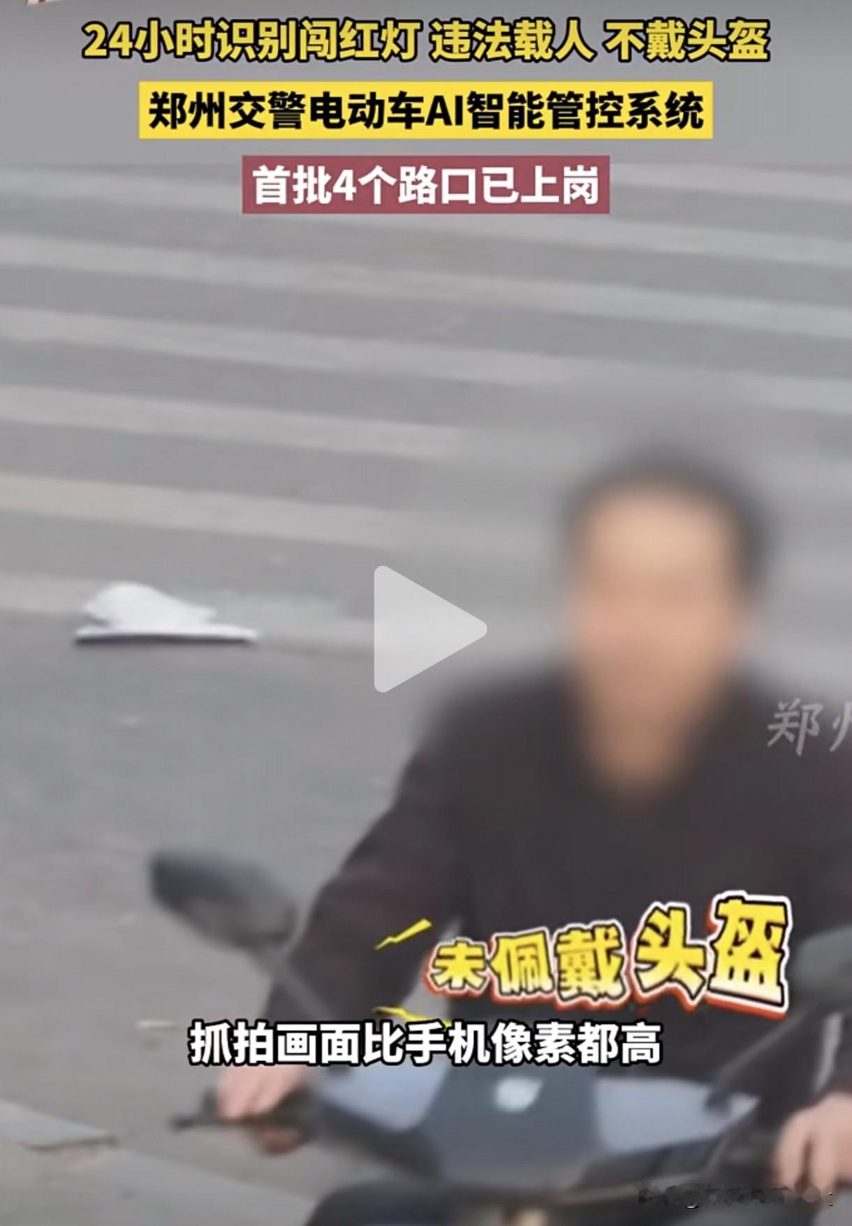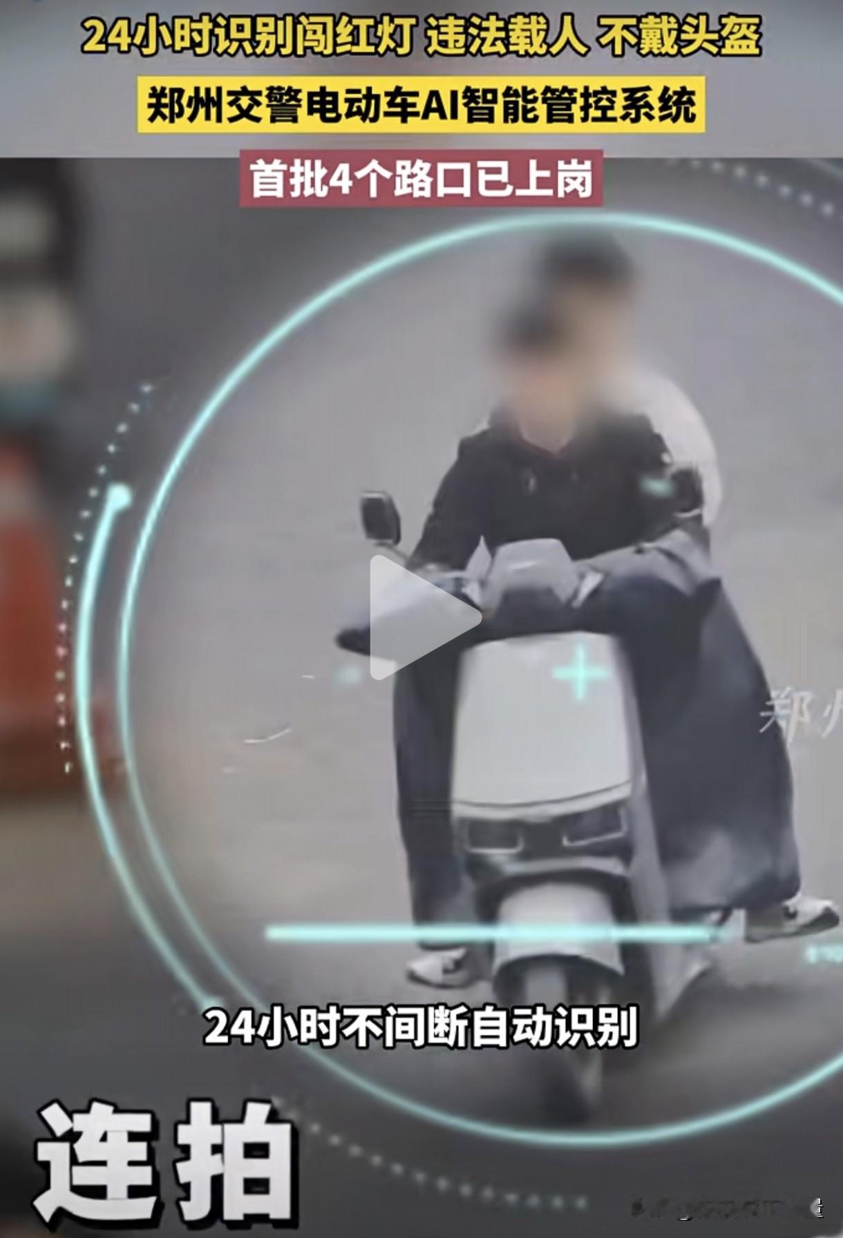 厉害了,河南郑州!媒体报道郑州交警电动车AI智能管控系统正式在四个路口上线了,可以24小时连拍,自动识别电动车闯红灯、违法载人、不戴头盔等违法行为,抓拍画面比手机像素还要高清。