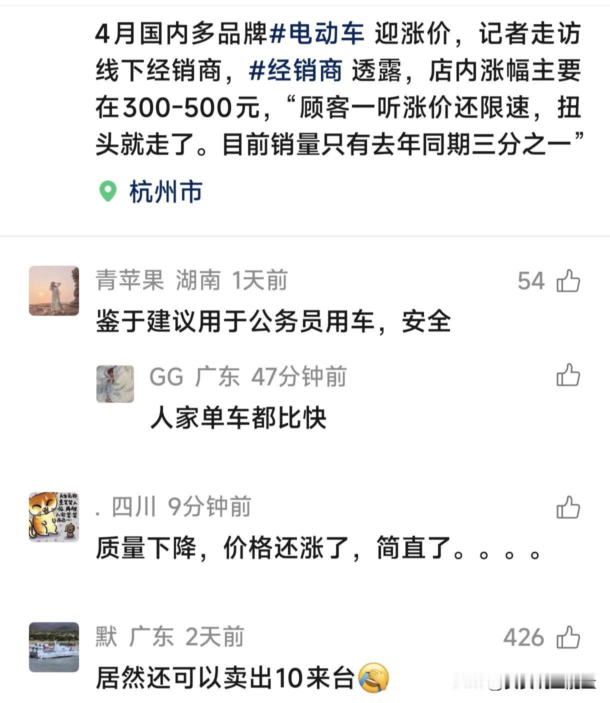 违背市场规律和消费者需求,强推新国标,应该是这些电动车销售遇冷的主要原因了。现在大家买电动车是因为物美价廉,还方便实用,现在这些优点大部分都没有了,谁还愿意去买呢?