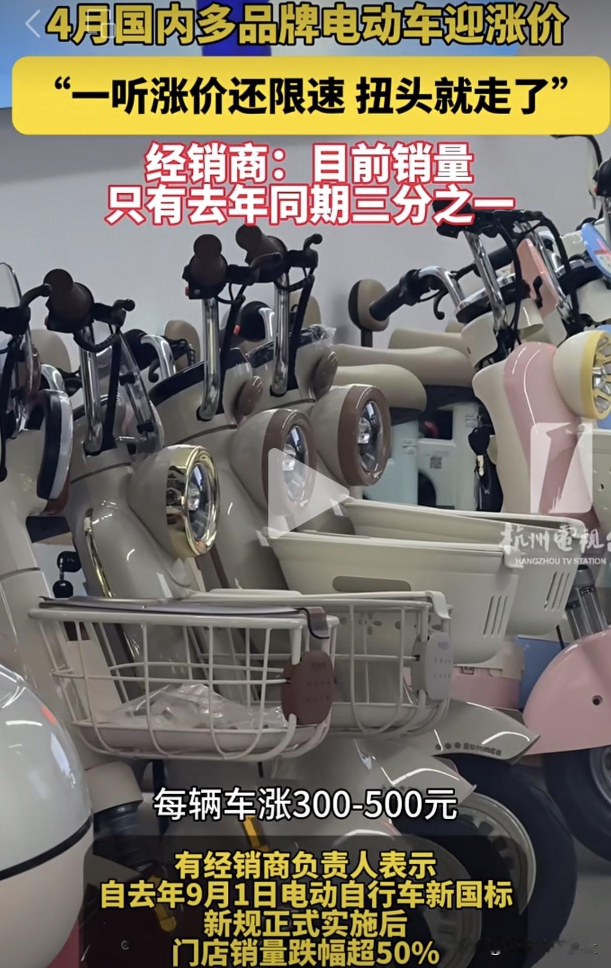 对面记者采访的镜头,电动车销售门店老板坦言,以前他每个月可以卖30辆电动车,实行新国标后只能卖10辆了。现在的新国标电动车采用新材料,每辆车比以前贵了300-500元,而且还限速25码,确实不好卖。
