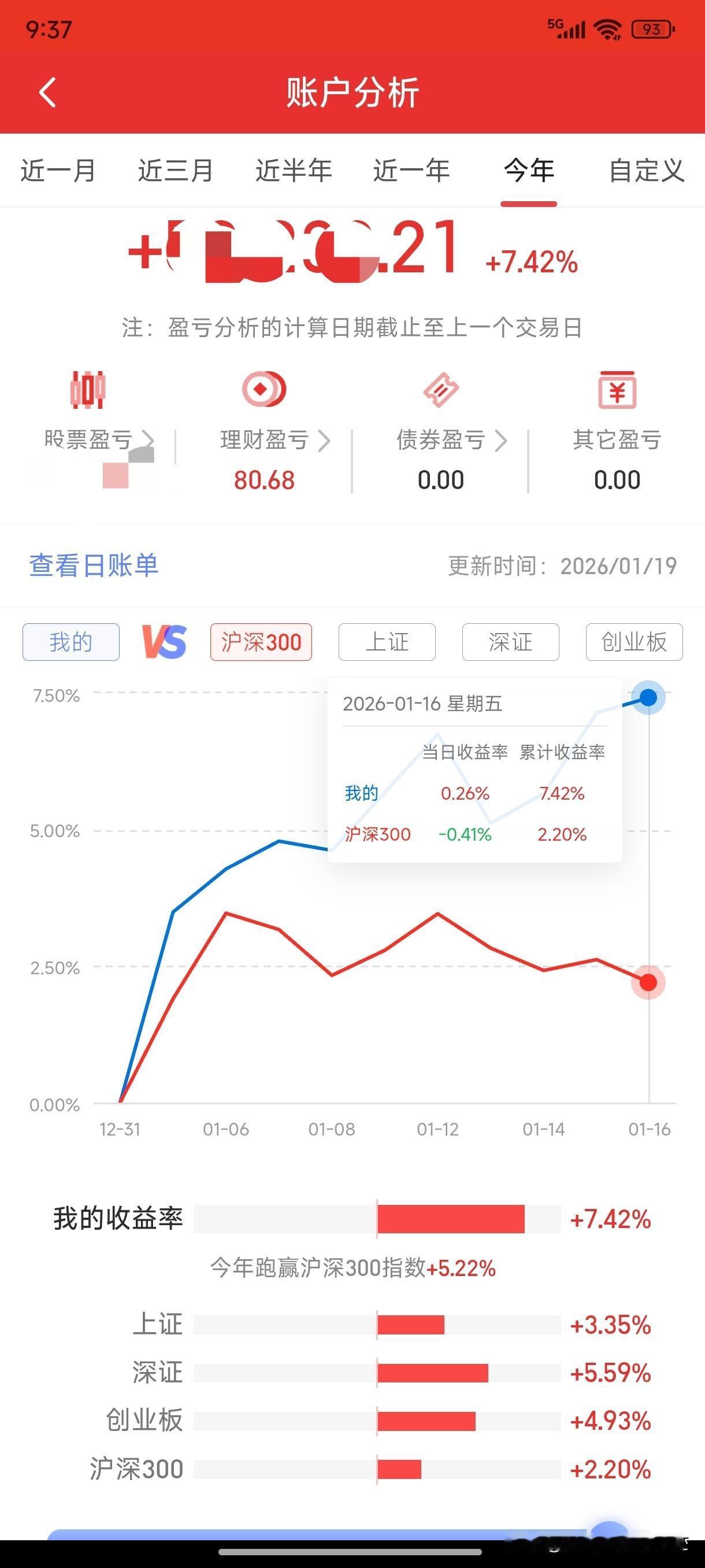 今年以来股市收益7.42%,其中第一周收益5.68%,第二周收益1.64%,跑赢