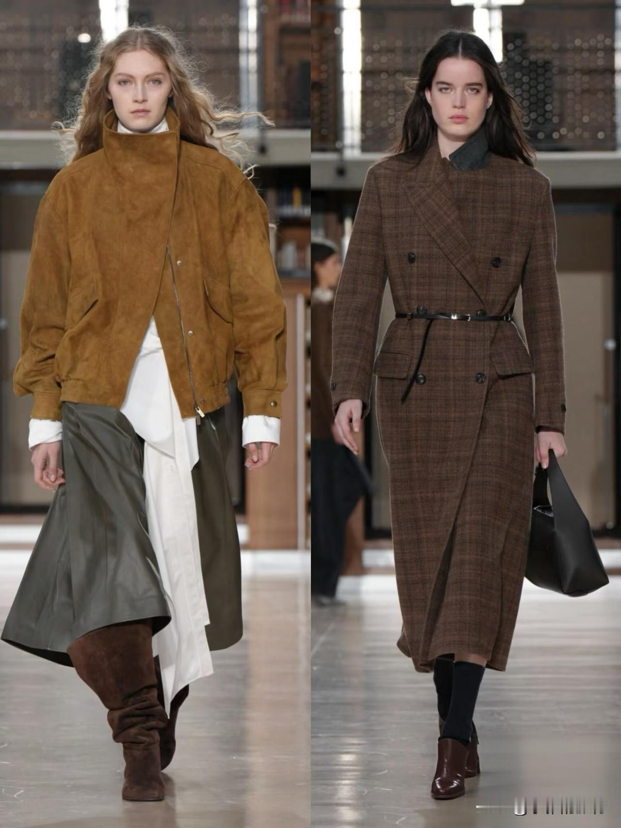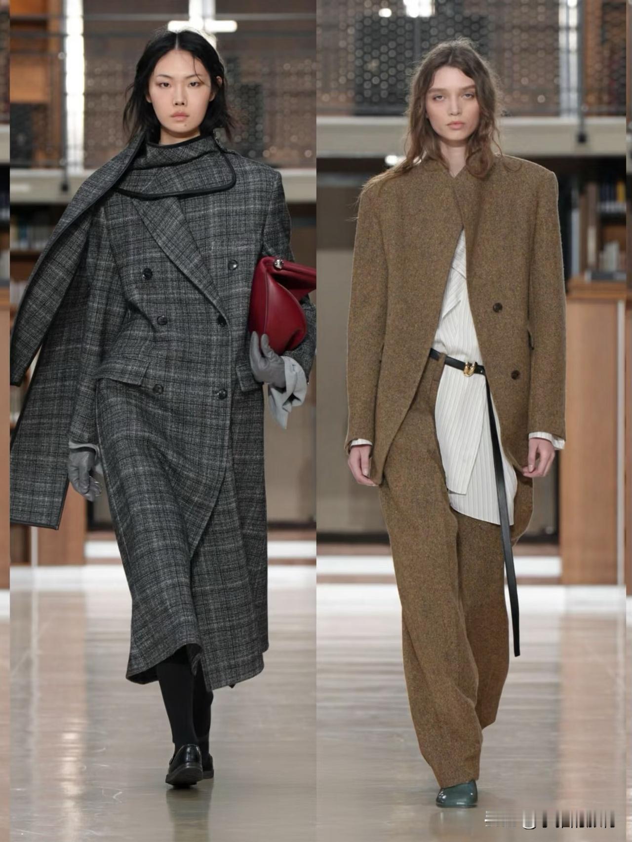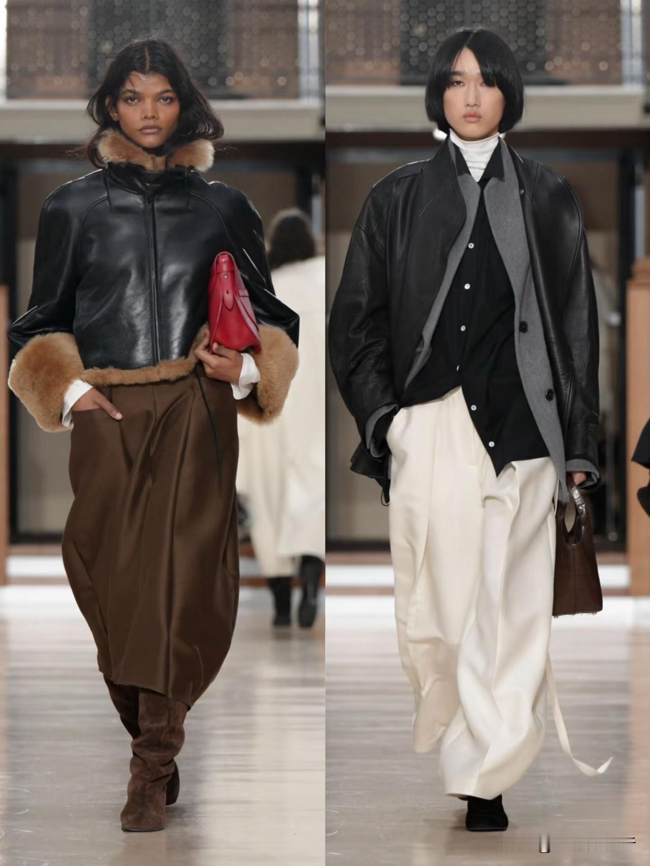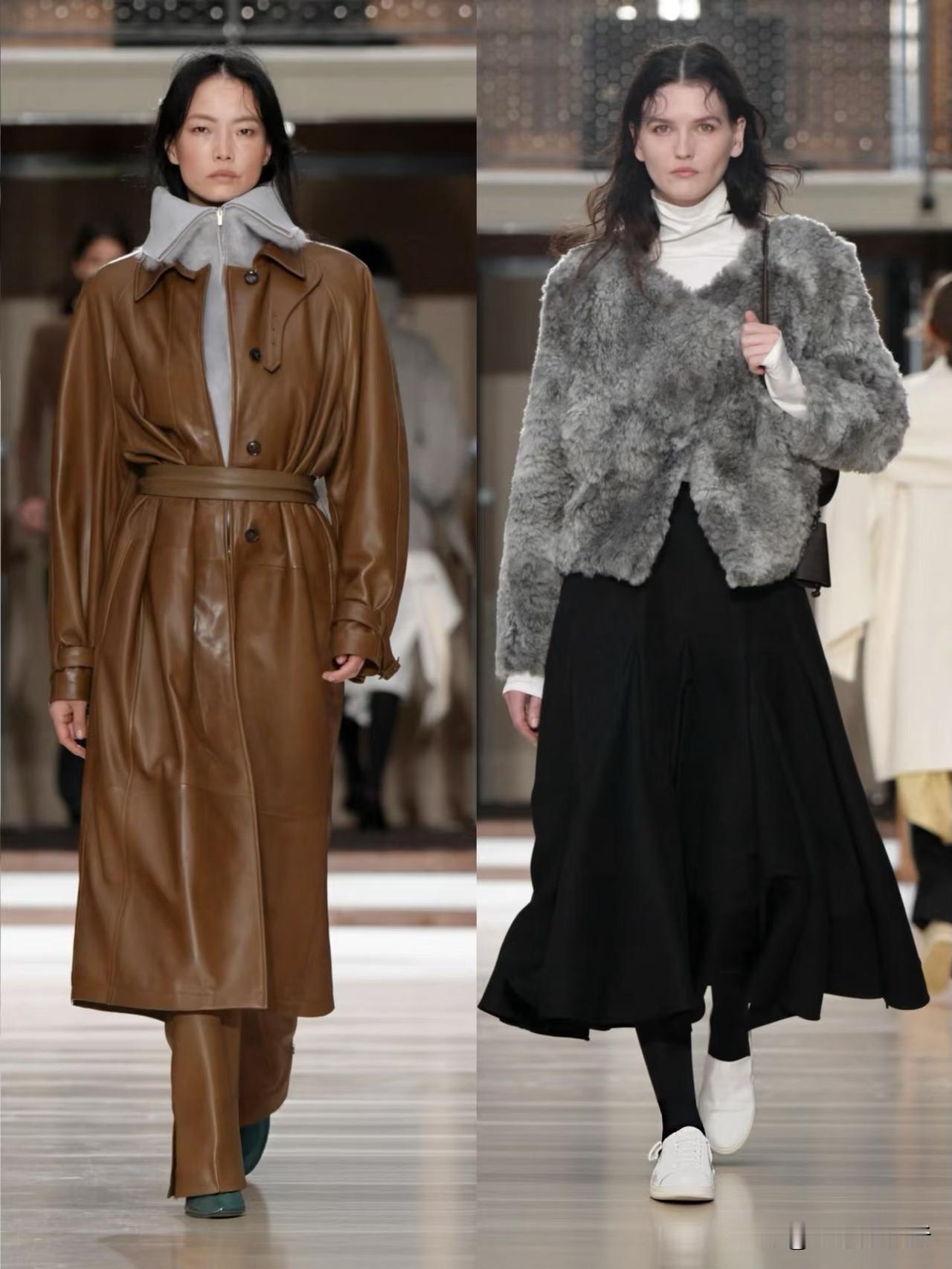 秀场造型融合利落建筑廓形与古典剪裁,不对称解构、模块化领口等细节精巧别致,羊毛、皮革与人造皮草碰撞出丰富肌理层次。低饱和中性色调温柔高级,兼具质感与实用性,职场通勤、日常出街都完美适配。