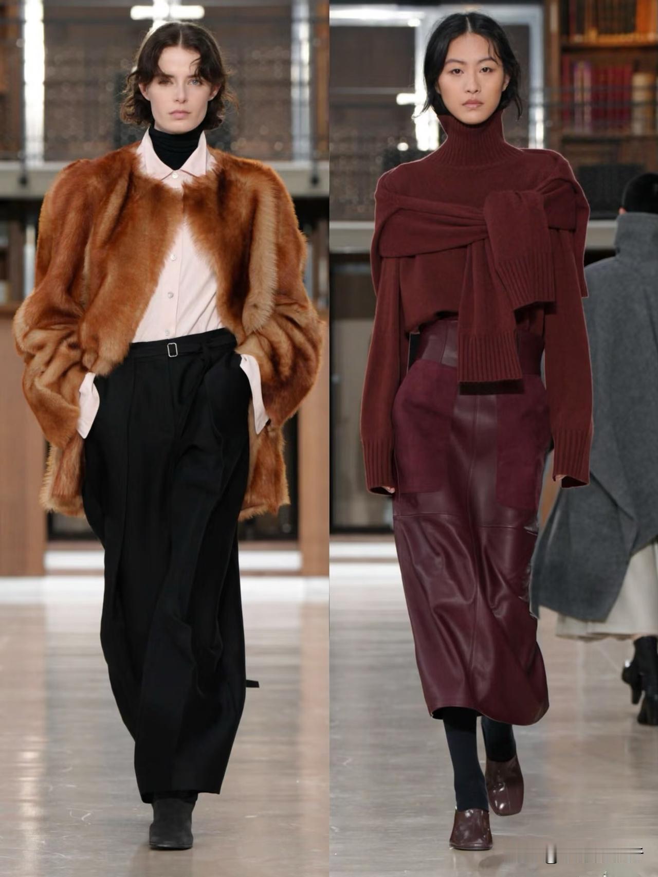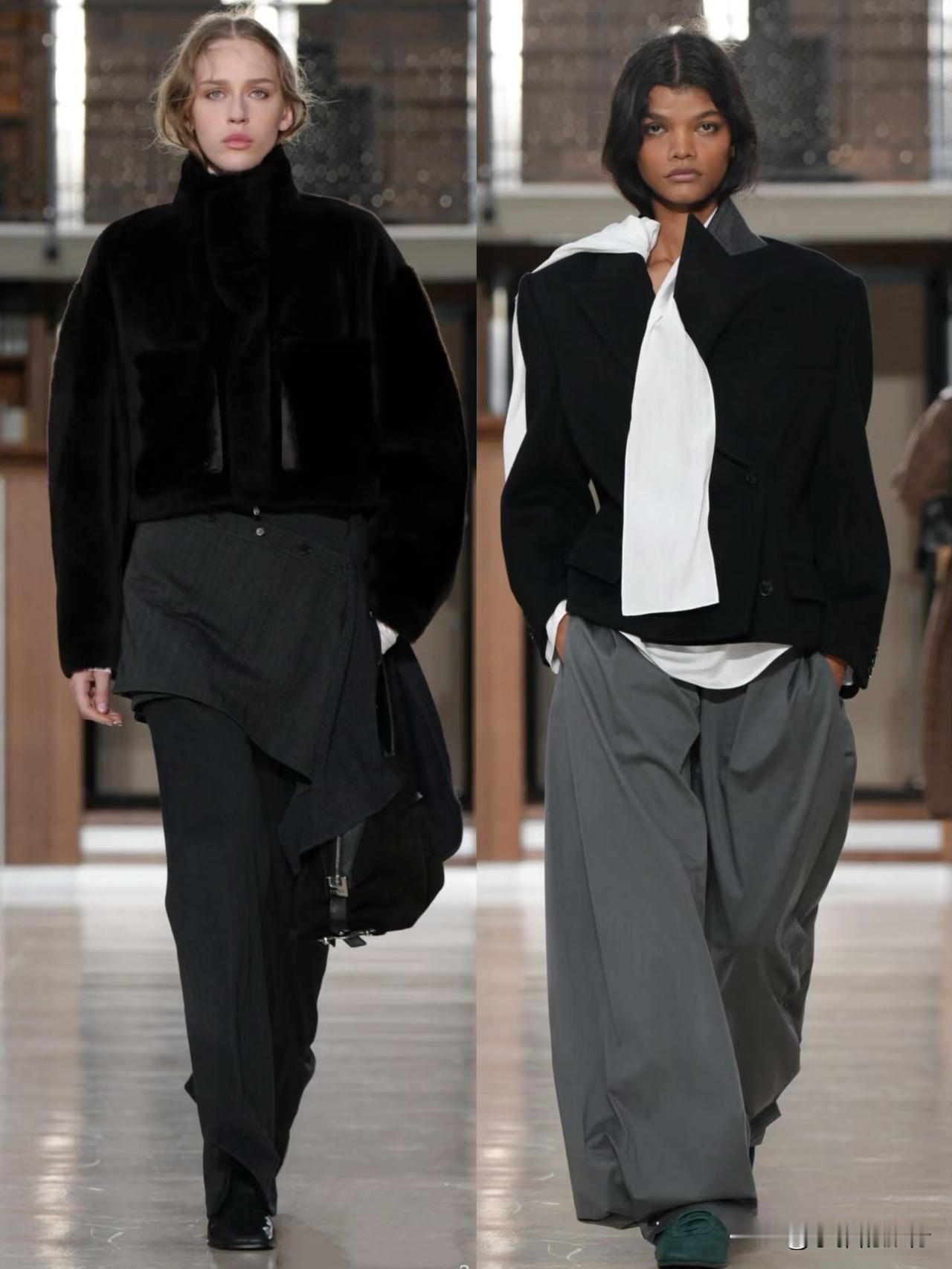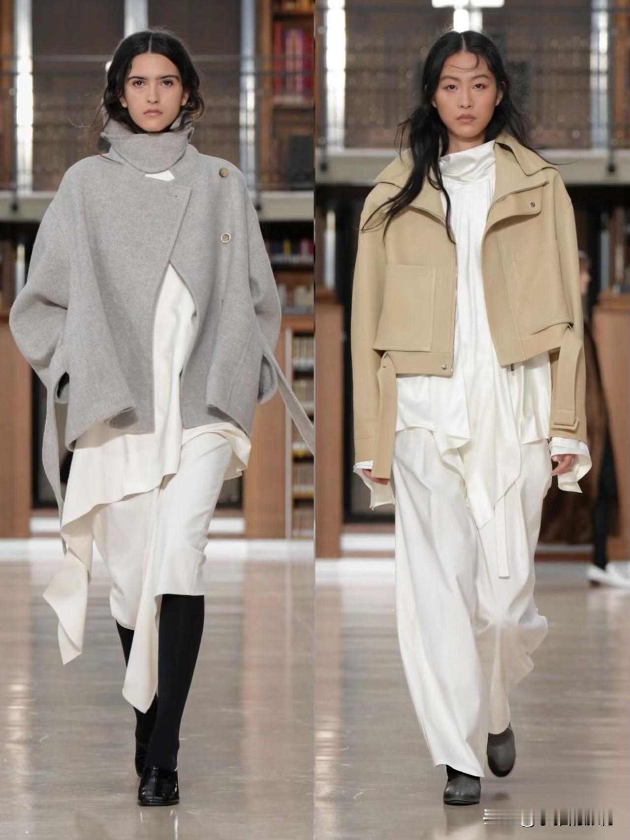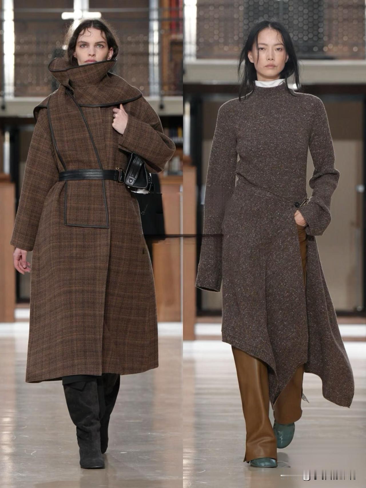 秀场造型融合利落建筑廓形与古典剪裁,不对称解构、模块化领口等细节精巧别致,羊毛、皮革与人造皮草碰撞出丰富肌理层次。低饱和中性色调温柔高级,兼具质感与实用性,职场通勤、日常出街都完美适配。