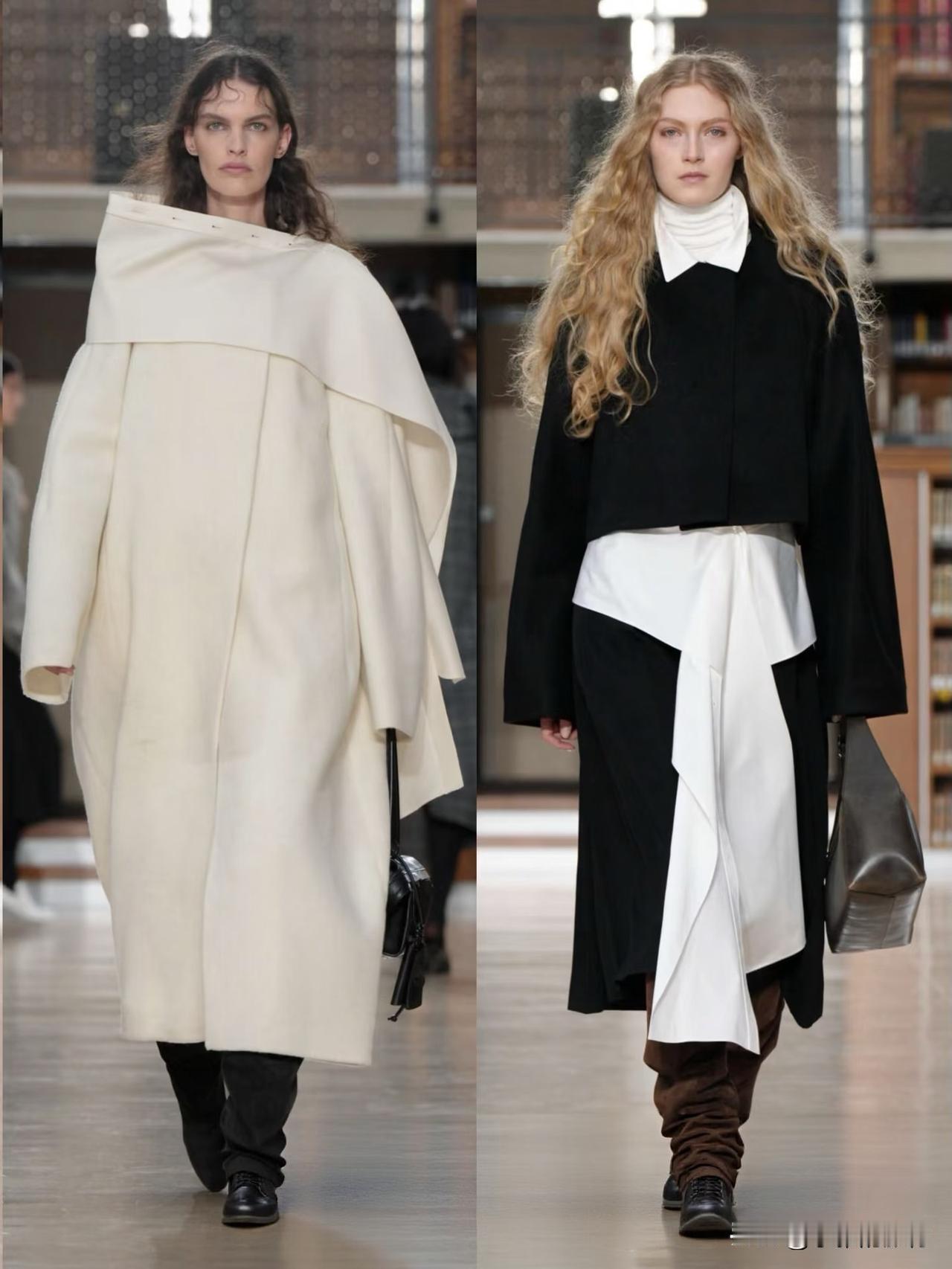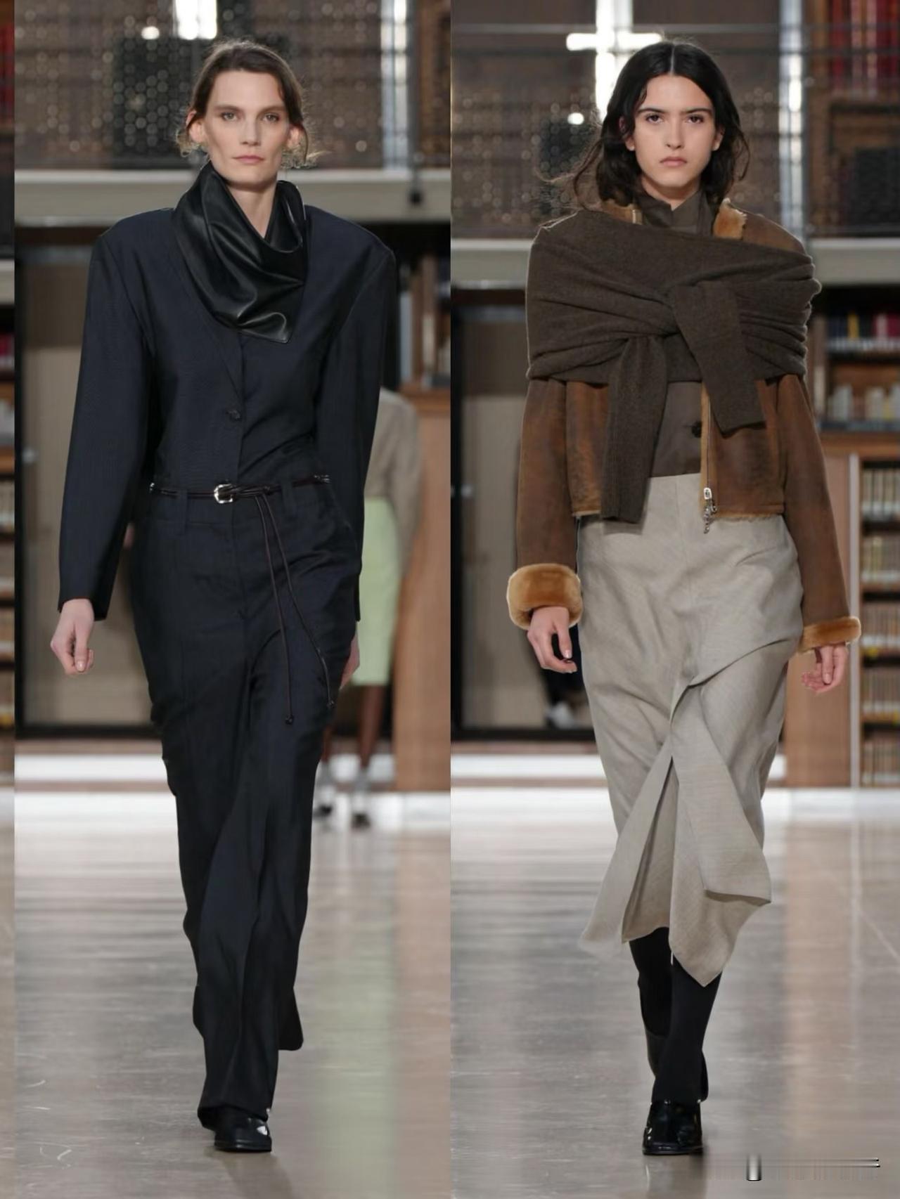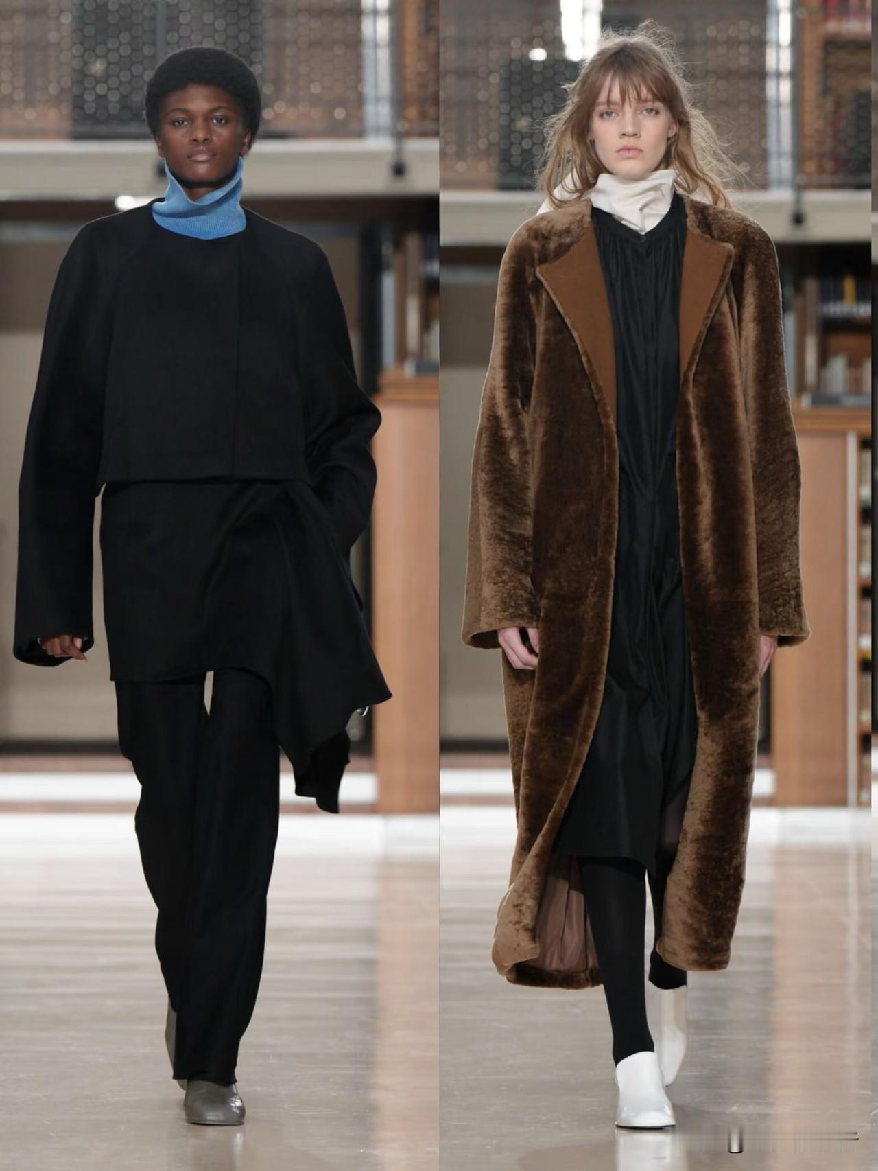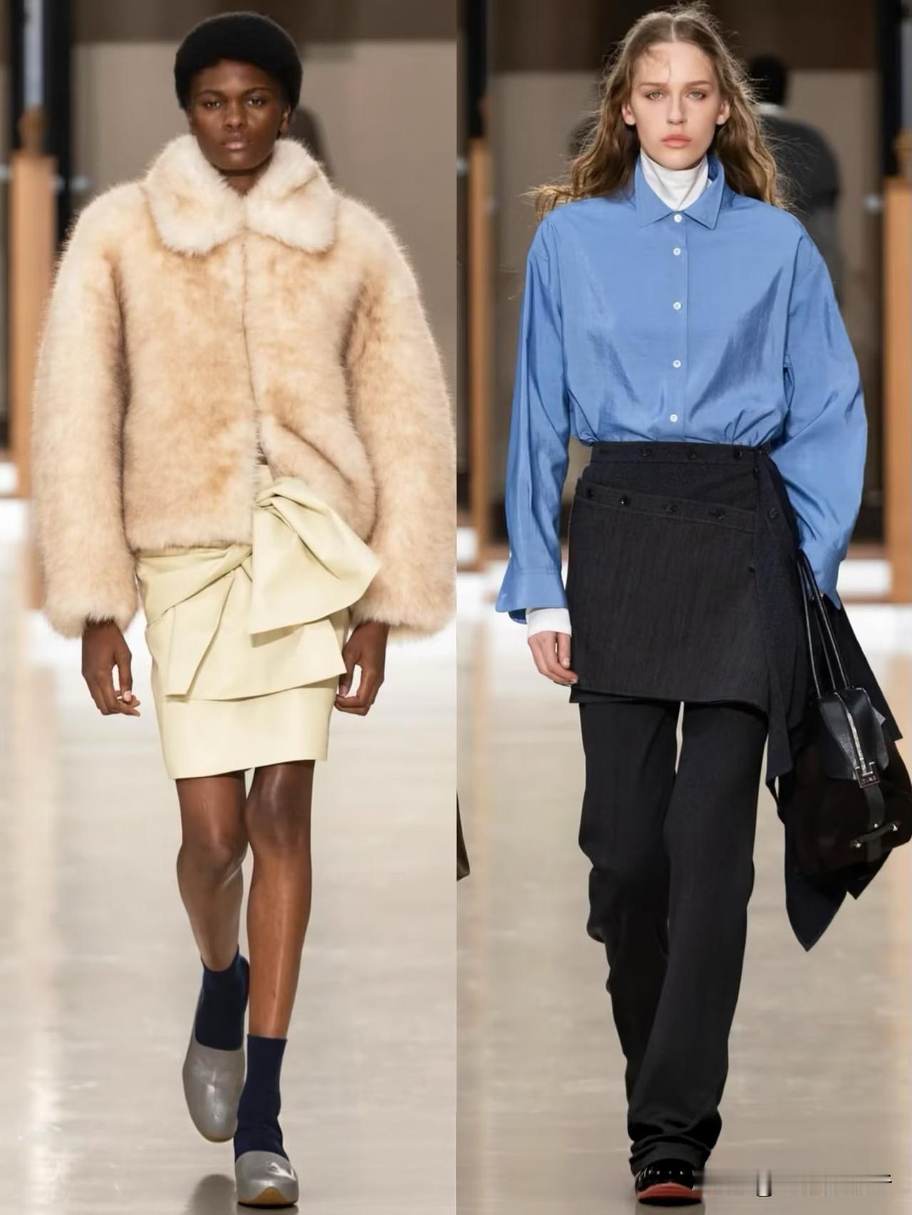 秀场造型融合利落建筑廓形与古典剪裁,不对称解构、模块化领口等细节精巧别致,羊毛、皮革与人造皮草碰撞出丰富肌理层次。低饱和中性色调温柔高级,兼具质感与实用性,职场通勤、日常出街都完美适配。