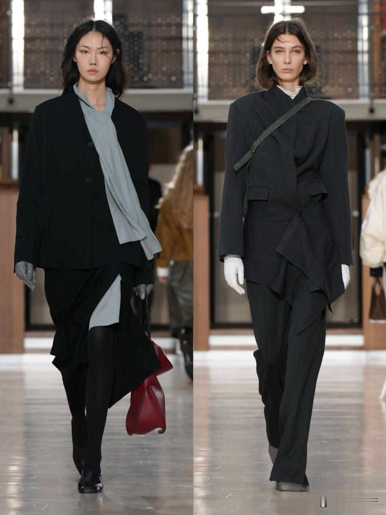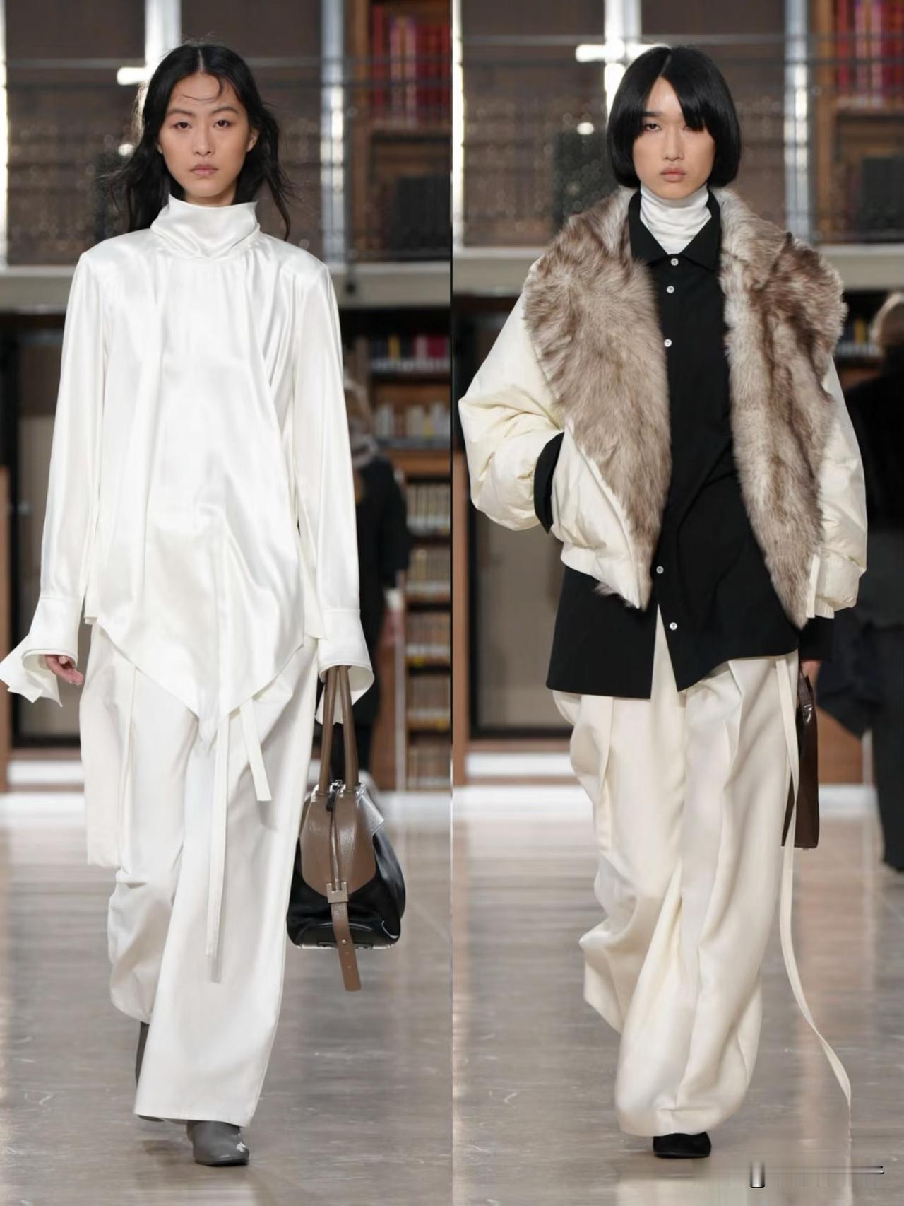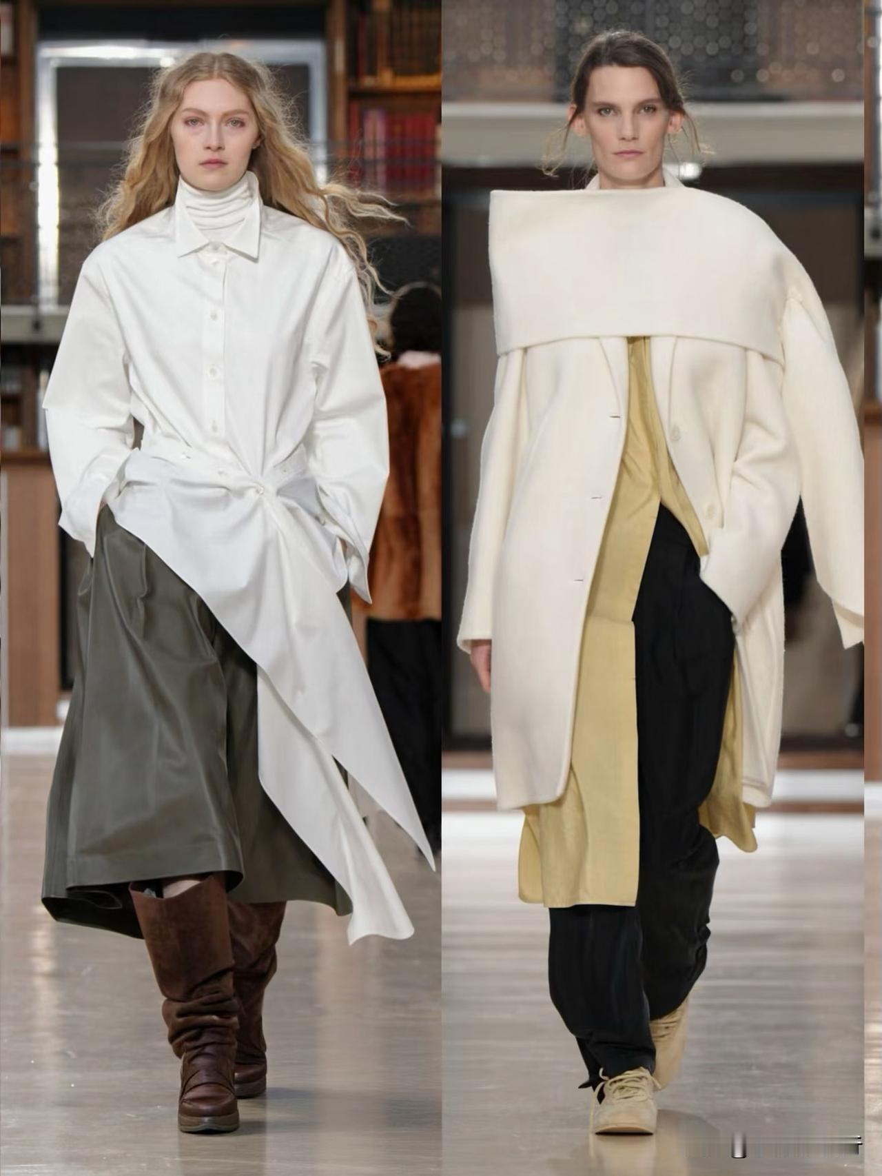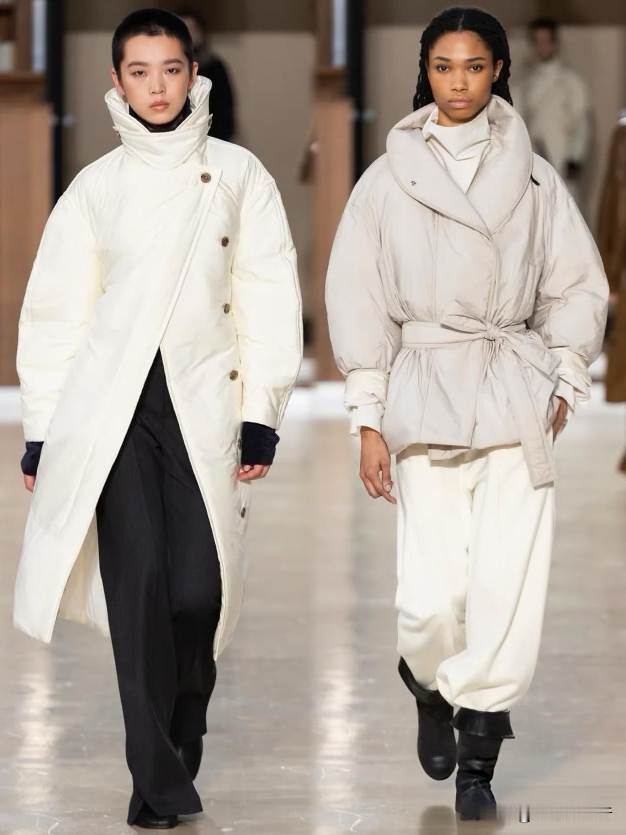 秀场造型融合利落建筑廓形与古典剪裁,不对称解构、模块化领口等细节精巧别致,羊毛、皮革与人造皮草碰撞出丰富肌理层次。低饱和中性色调温柔高级,兼具质感与实用性,职场通勤、日常出街都完美适配。