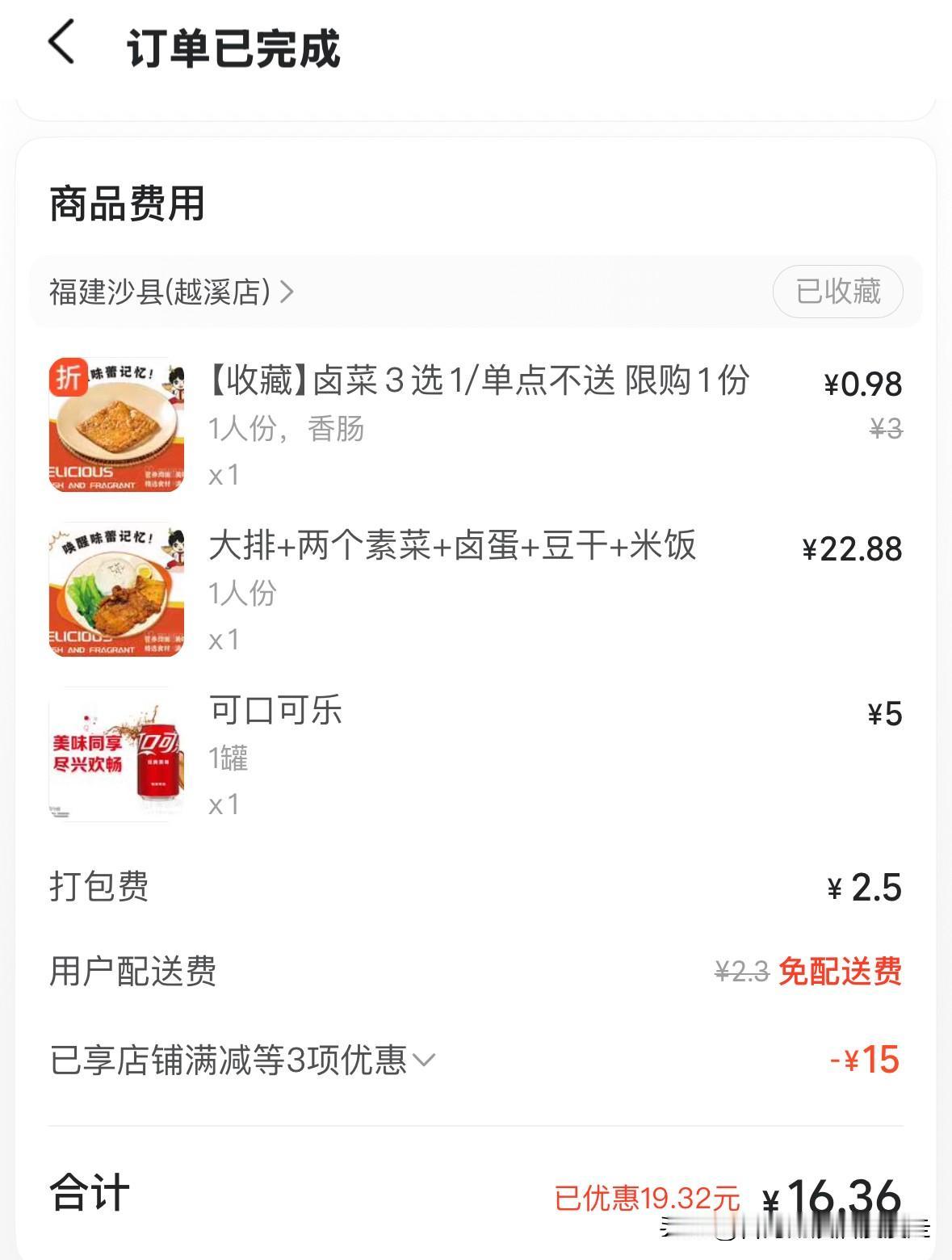果然,菜色也很对我的味蕾。大排香嫩可口,素菜也很新鲜,餐盒里的卤蛋、豆干、香肠都没有雷点,白米饭也能吃出米香。这一盒营养均衡、可口美味的快餐,再加上一瓶冰镇饮料,总共才16块多,感觉比自己做饭都划算。