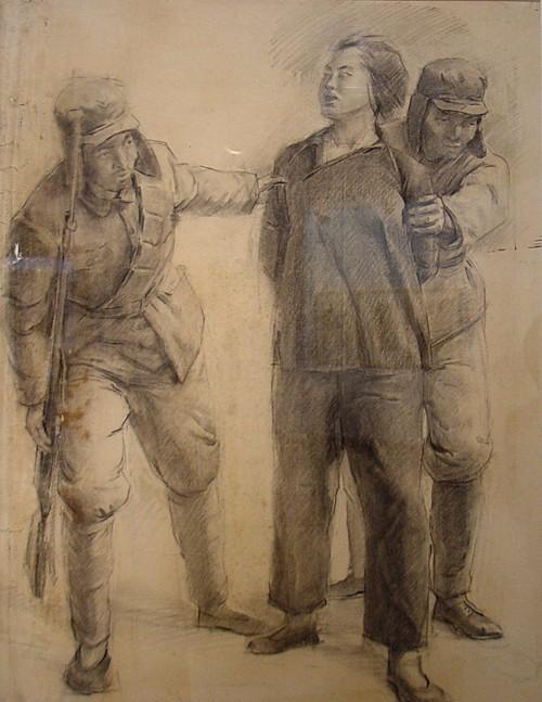 油画《开国大典》的作者董希文也曾短暂国外留学,他于1933年入苏州美术专科学校,师从颜文樑等学习西画,1934年转入杭州国立艺术专科学校(中国美术学院前身),师从林风眠、常书鸿、李超士、潘天寿等,兼修中西绘画。1939年被选为留法预备班学生,赴越南河内法国国立安南美术专科学校学习,后因战事中断,被迫回国。1943年受常书鸿邀请,赴敦煌艺术研究所临摹壁画,历时近三年。1946年应徐悲鸿之邀,任北平艺术专科学校副教授,后历任中央美术学院教授、油画系第三工作室主任等。