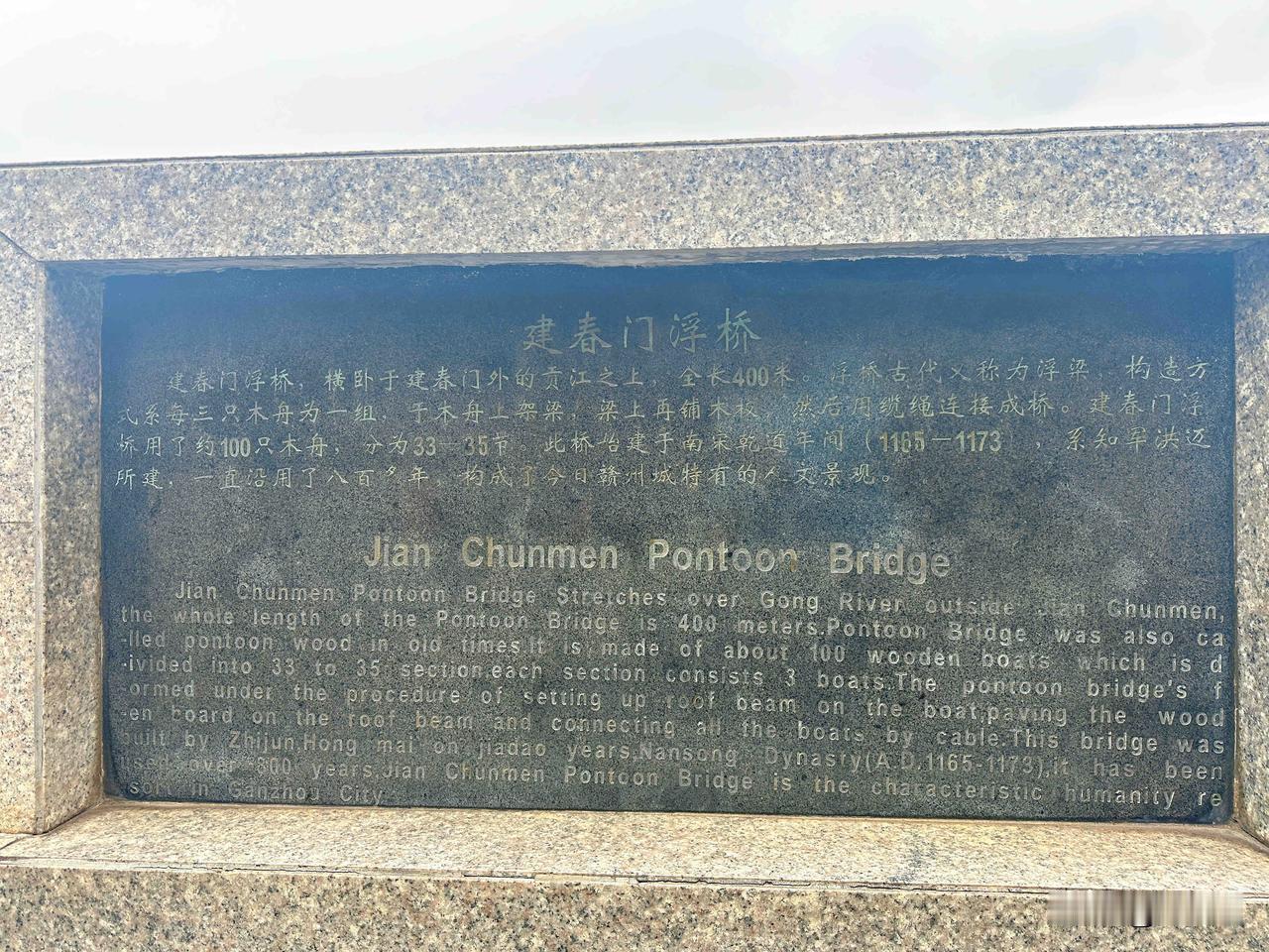 到了赣州,一定会去宋城打个卡,city walk的路线,朋友们的攻略里都有,我们自然不能免俗,导航到宋城停车场🅿️,出来就是蒋经国故居,旁边是全国现存唯一的宋代铭文砖城墙,城墙脚下看到了一座浮桥(指示牌上也写着“浮桥”),没料想这个“西河浮桥”并不是“古浮桥”(感觉像文字游戏,也怪自己攻略没做好)!