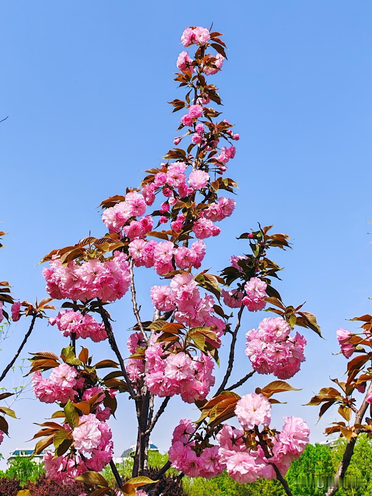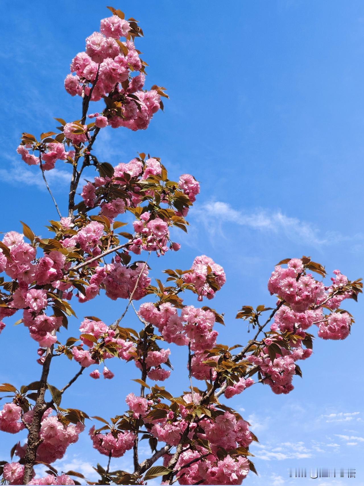 粉嫩樱花绽新春,蓝天白云映芳华。