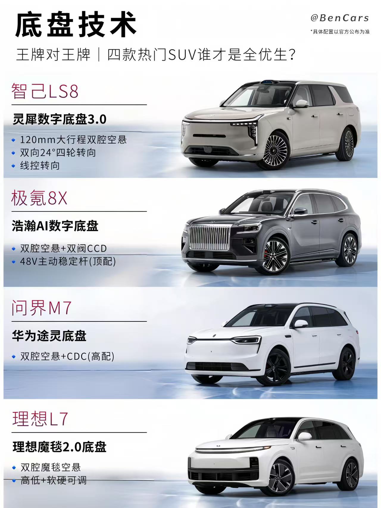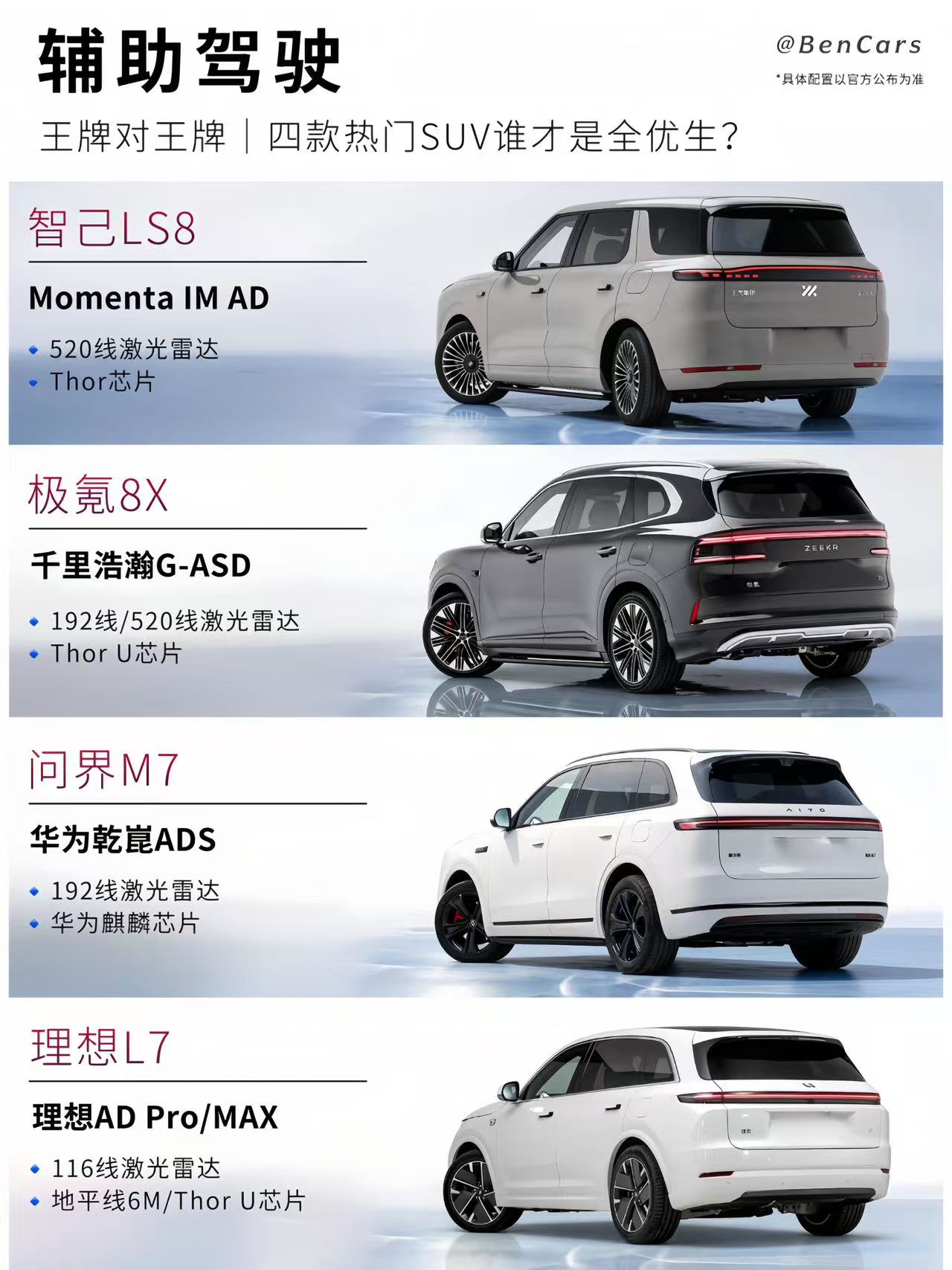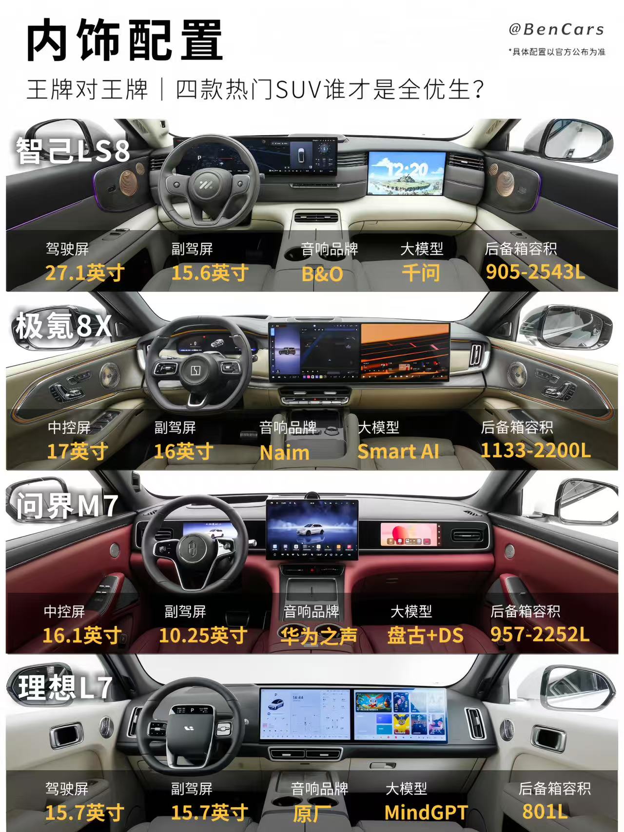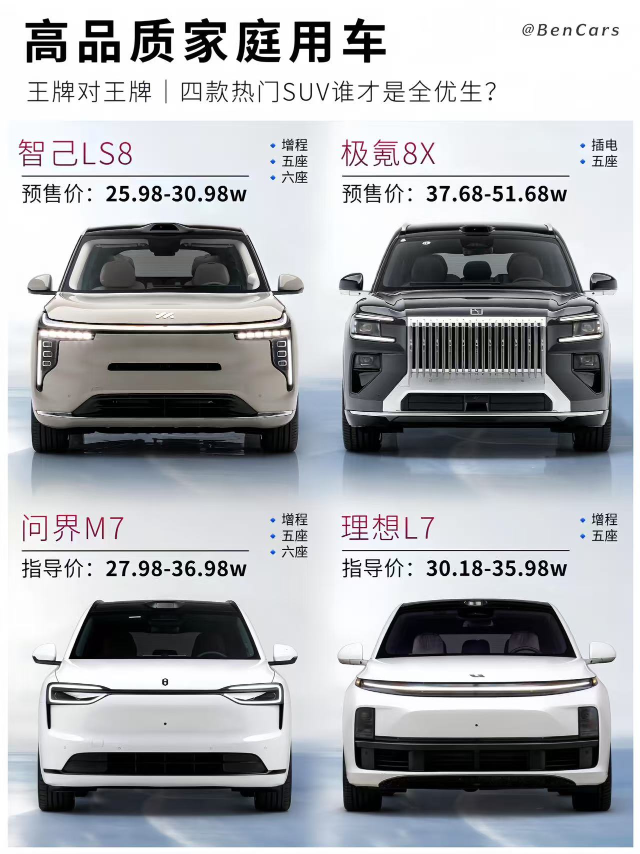 最近身边好几个朋友都在看30万级的大五座SUV,目标基本锁定在这四款:智己LS8、极氪8X、问界M7、理想L7。聊下来发现,大家的需求其实挺分化的,有人要续航安全感,有人要科技感,还有人纯粹是"华为全家桶"用户。