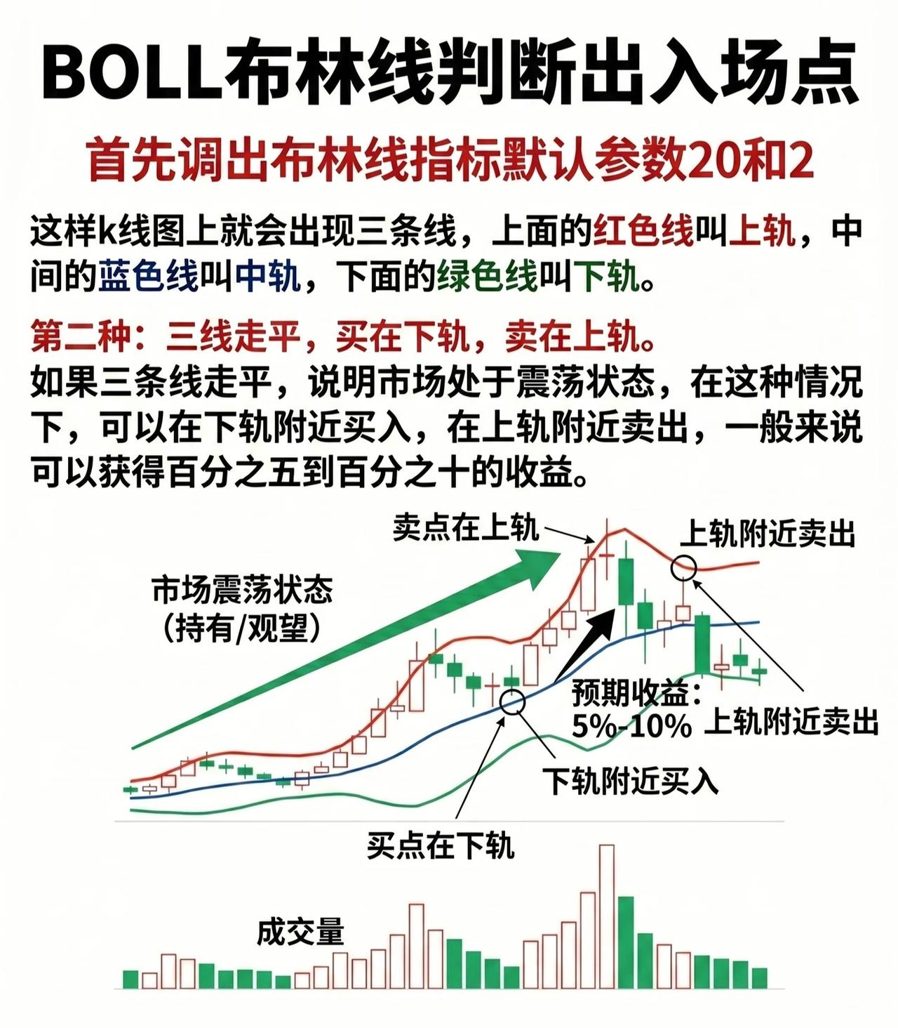 - 策略:「买在下轨,卖在上轨」,适合波段操作。震荡行情中,下轨是支撑买点(价格回踩下轨后易反弹),上轨是压力卖点(价格触碰上轨后易回落)。一般可获取5%-10%的波段收益。