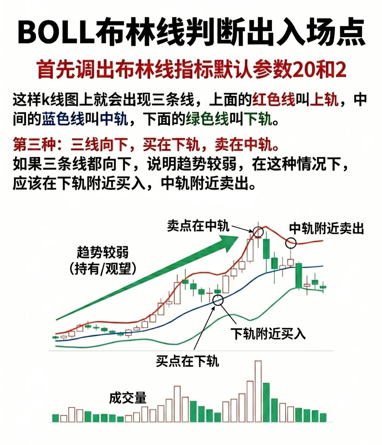 - 策略:「买在下轨,卖在中轨」,短线博弈反弹。弱势行情中,下轨是阶段性支撑(价格超跌后易反弹),但中轨是短期压力(反弹至中轨附近易再次回落),需快进快出。
